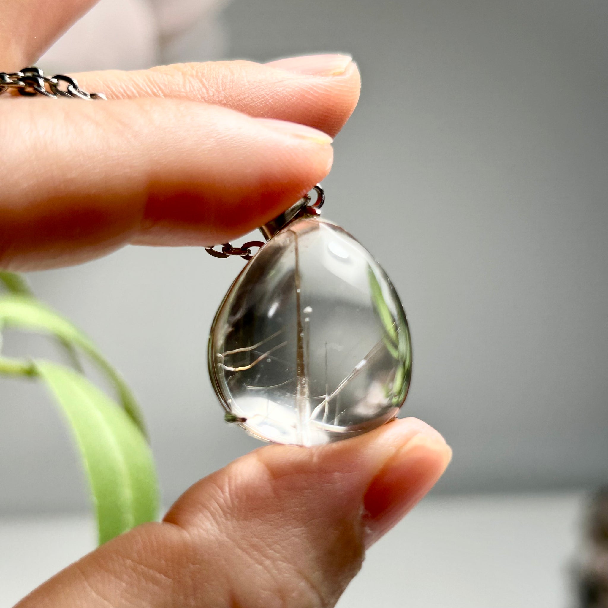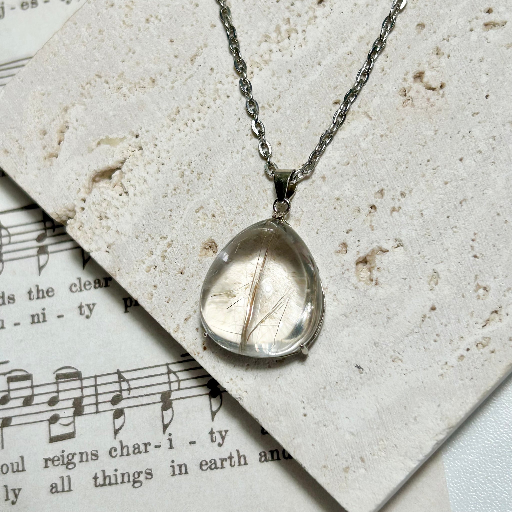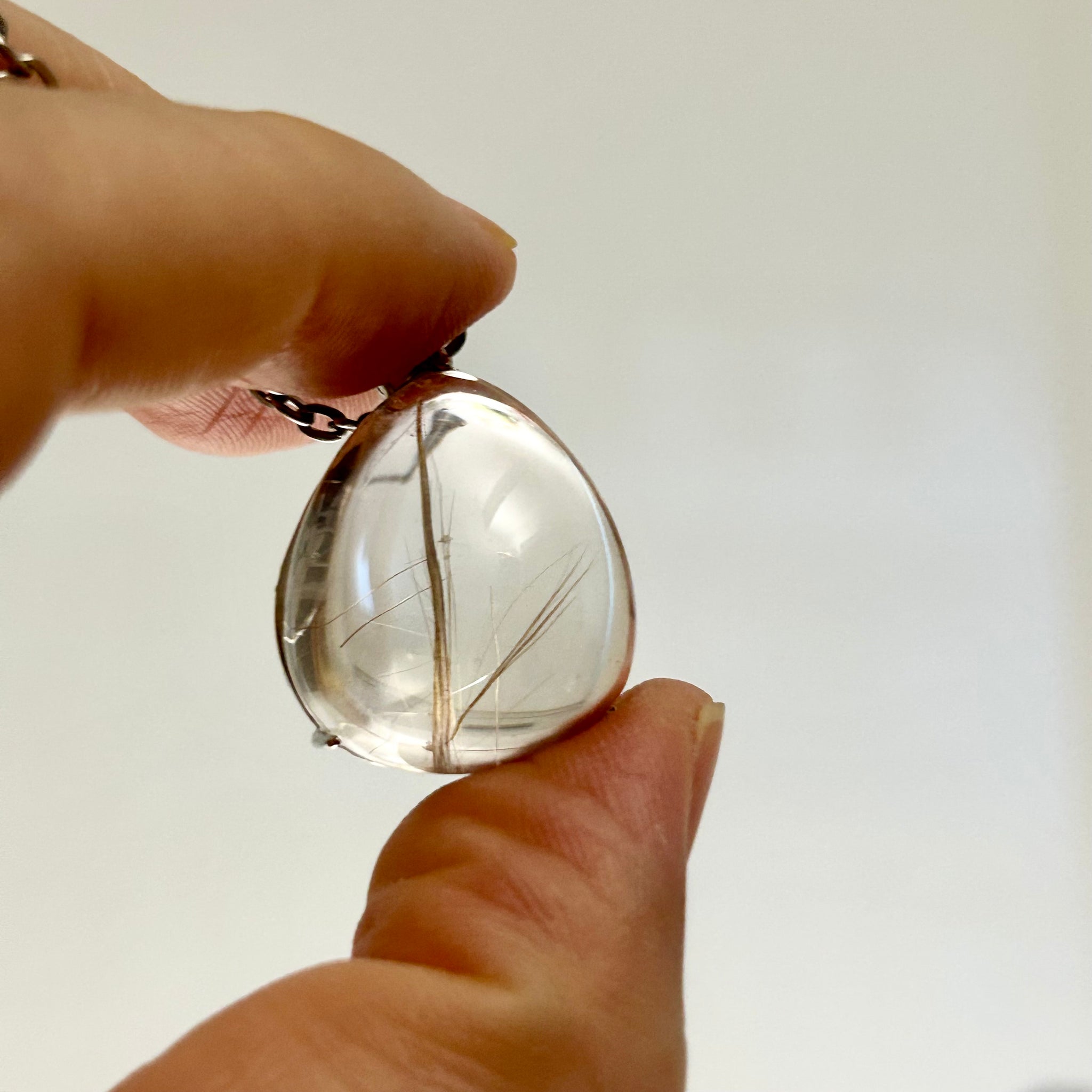 A one of a kind golden rutilated quartz pendant featuring a strong central rutile line and natural fine inclusions.
