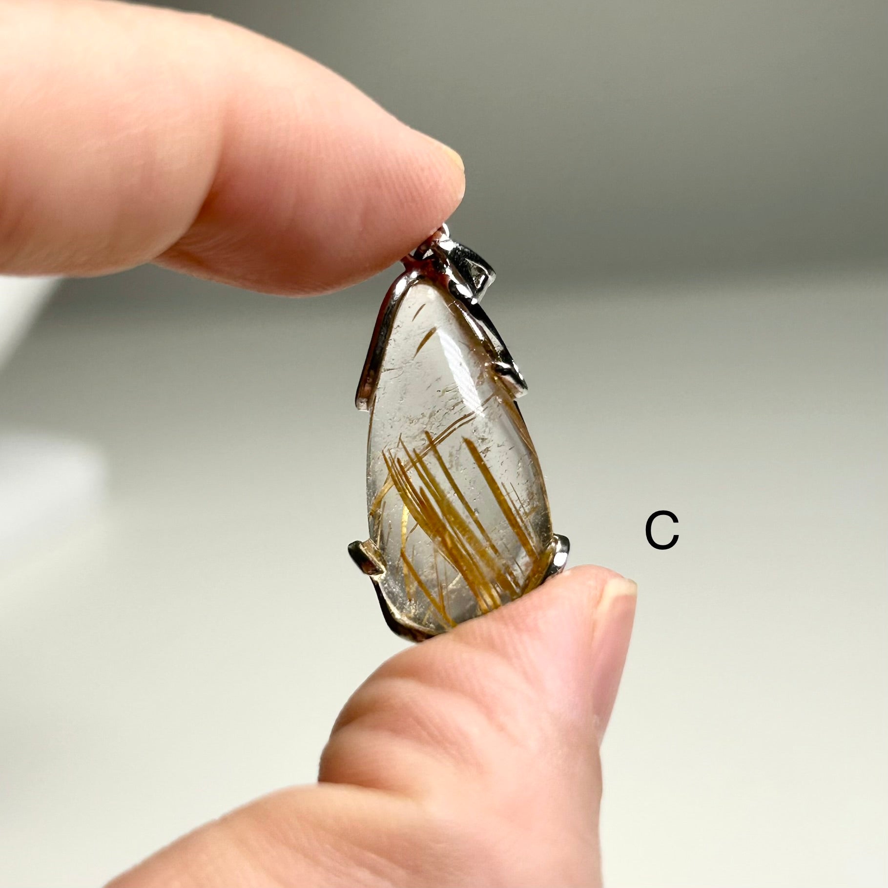 A collection of one-of-a-kind golden rutilated quartz pendants, each featuring natural needle-like inclusions suspended within clear quartz.