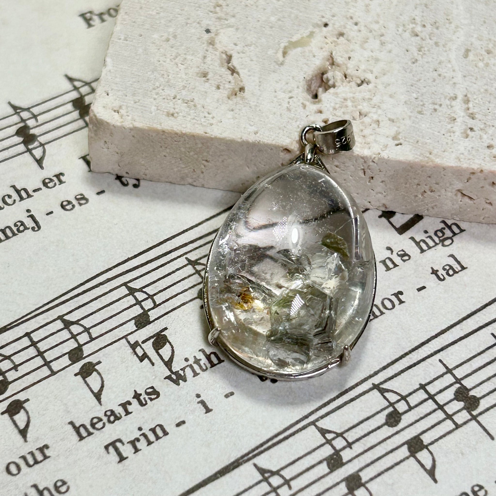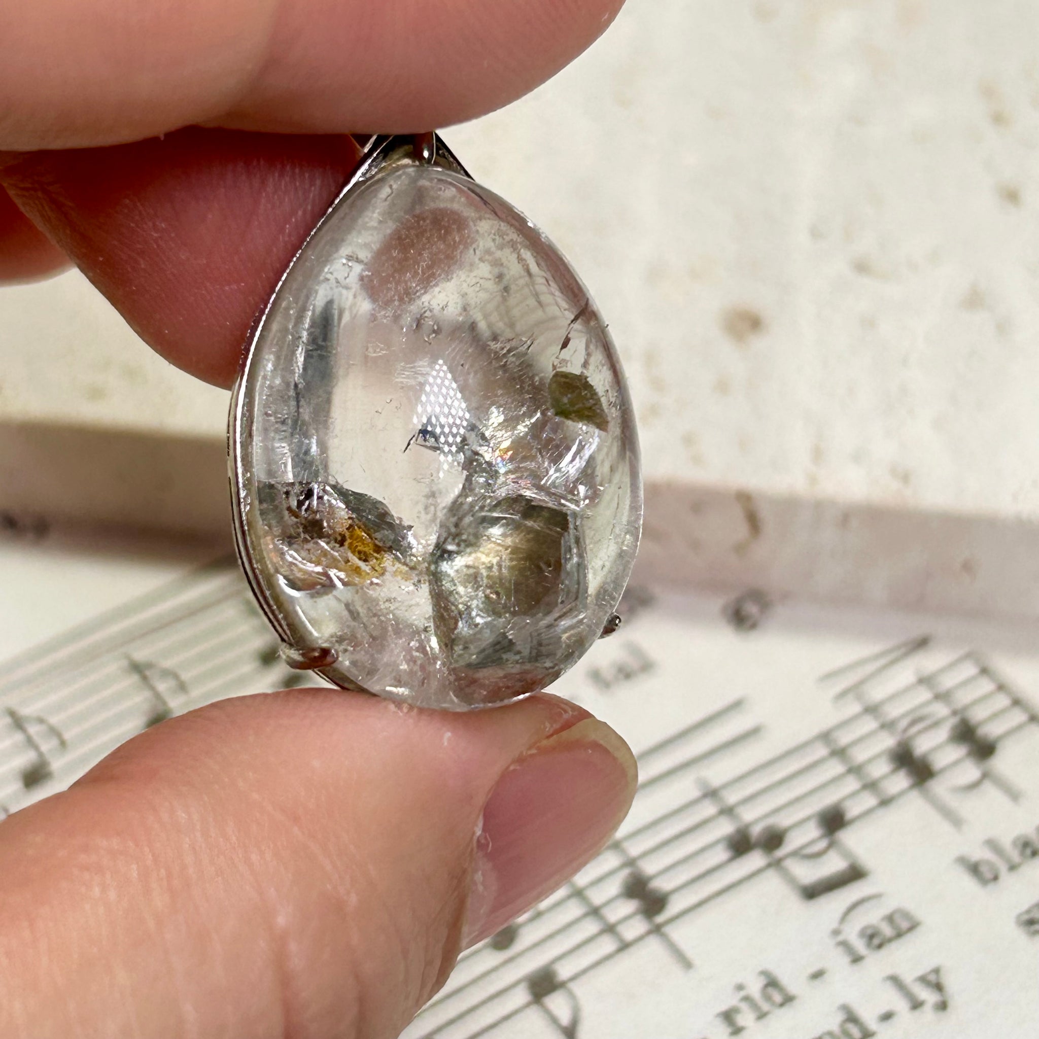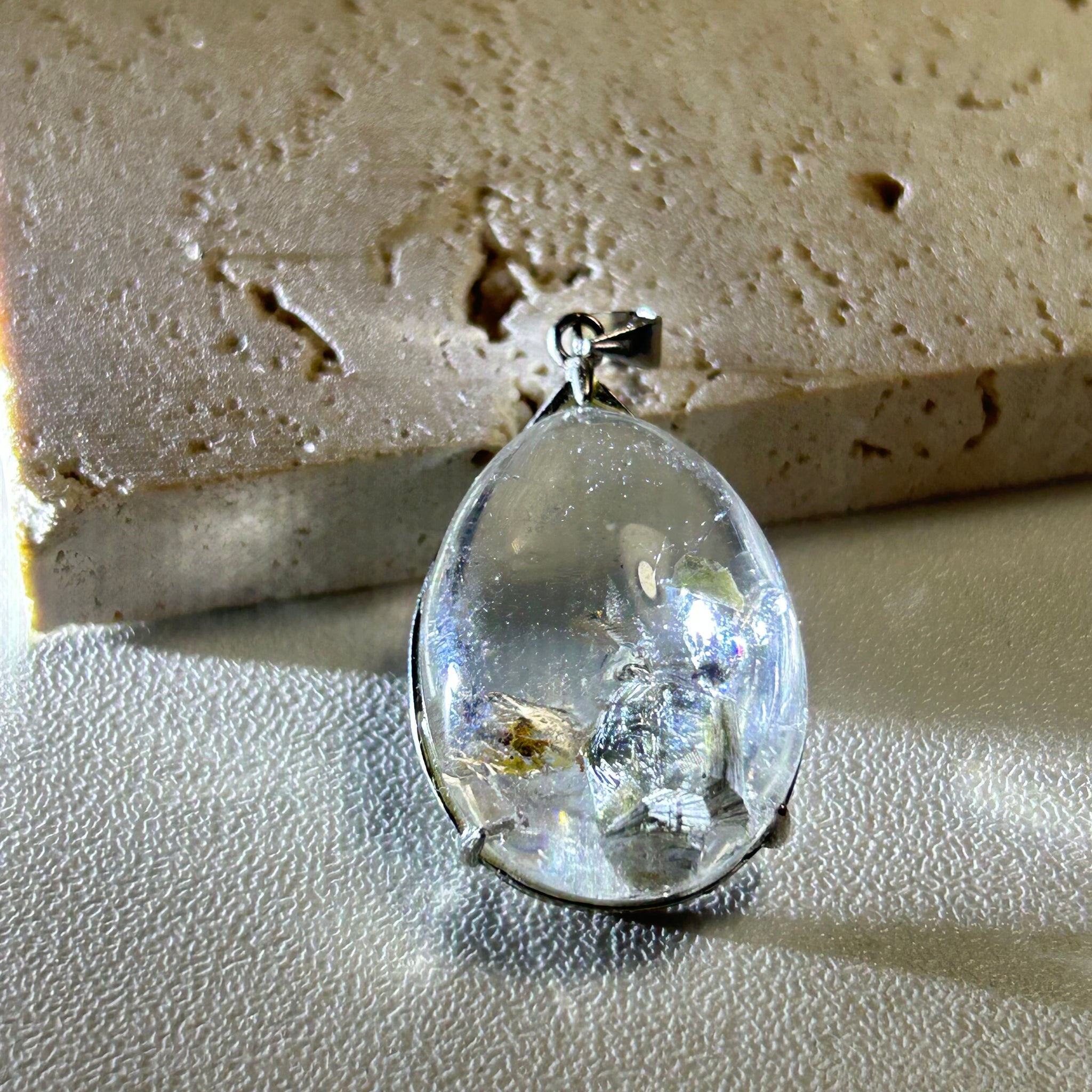 A one of a kind clear quartz pendant featuring natural mica inclusions and subtle rainbow reflections.