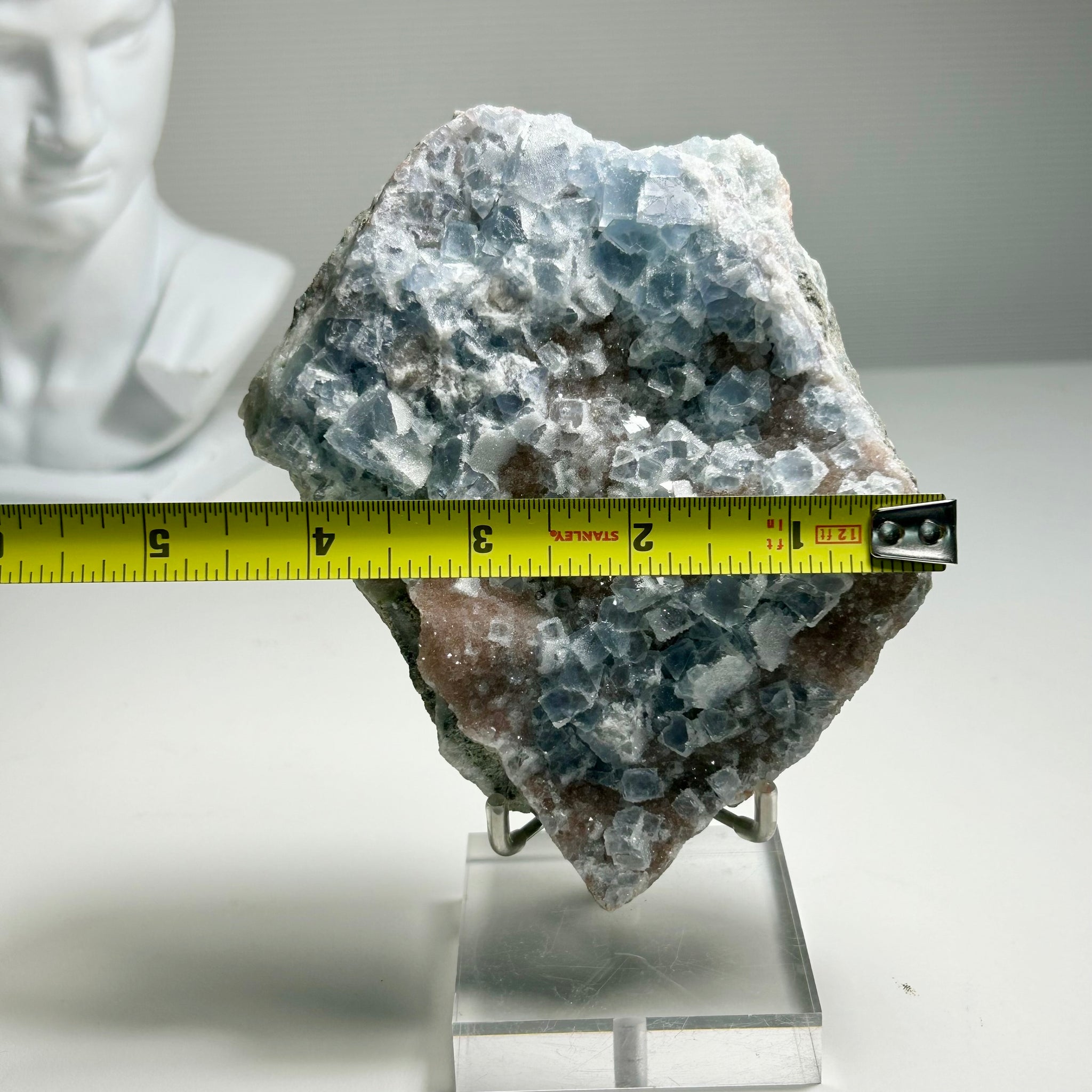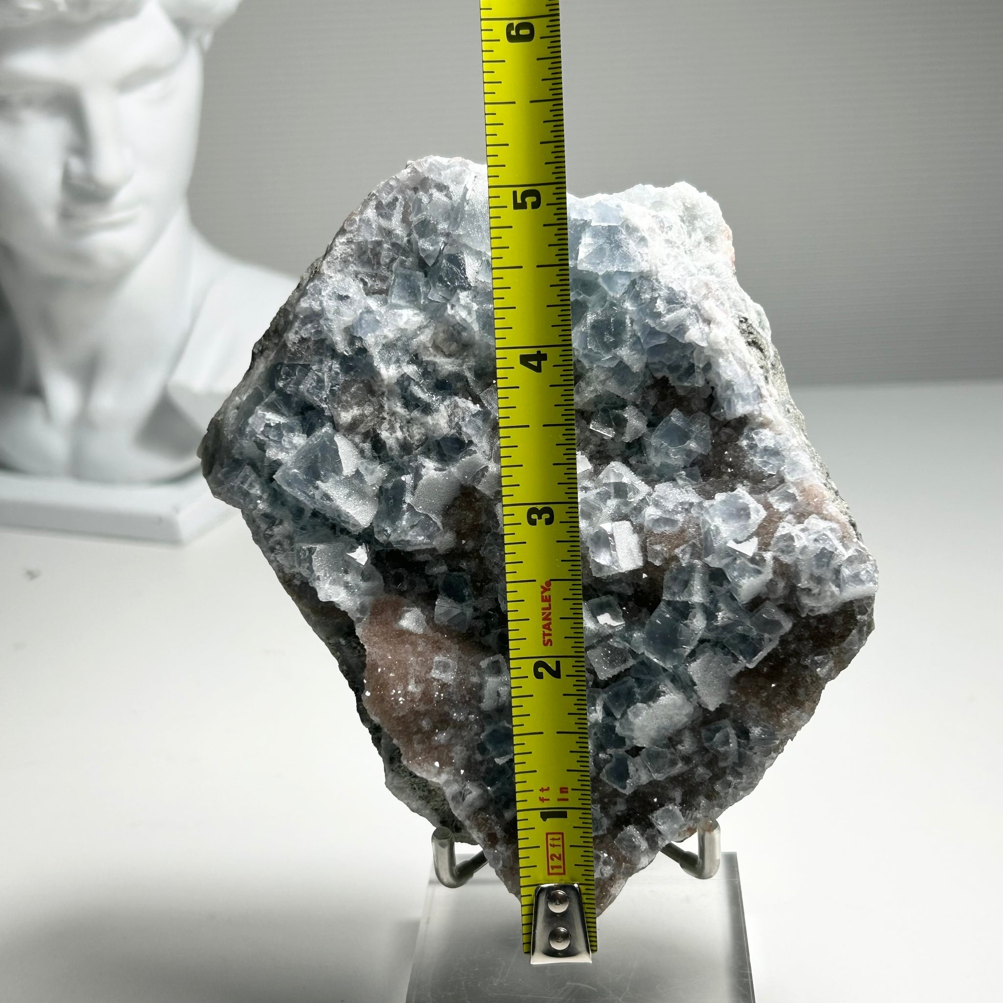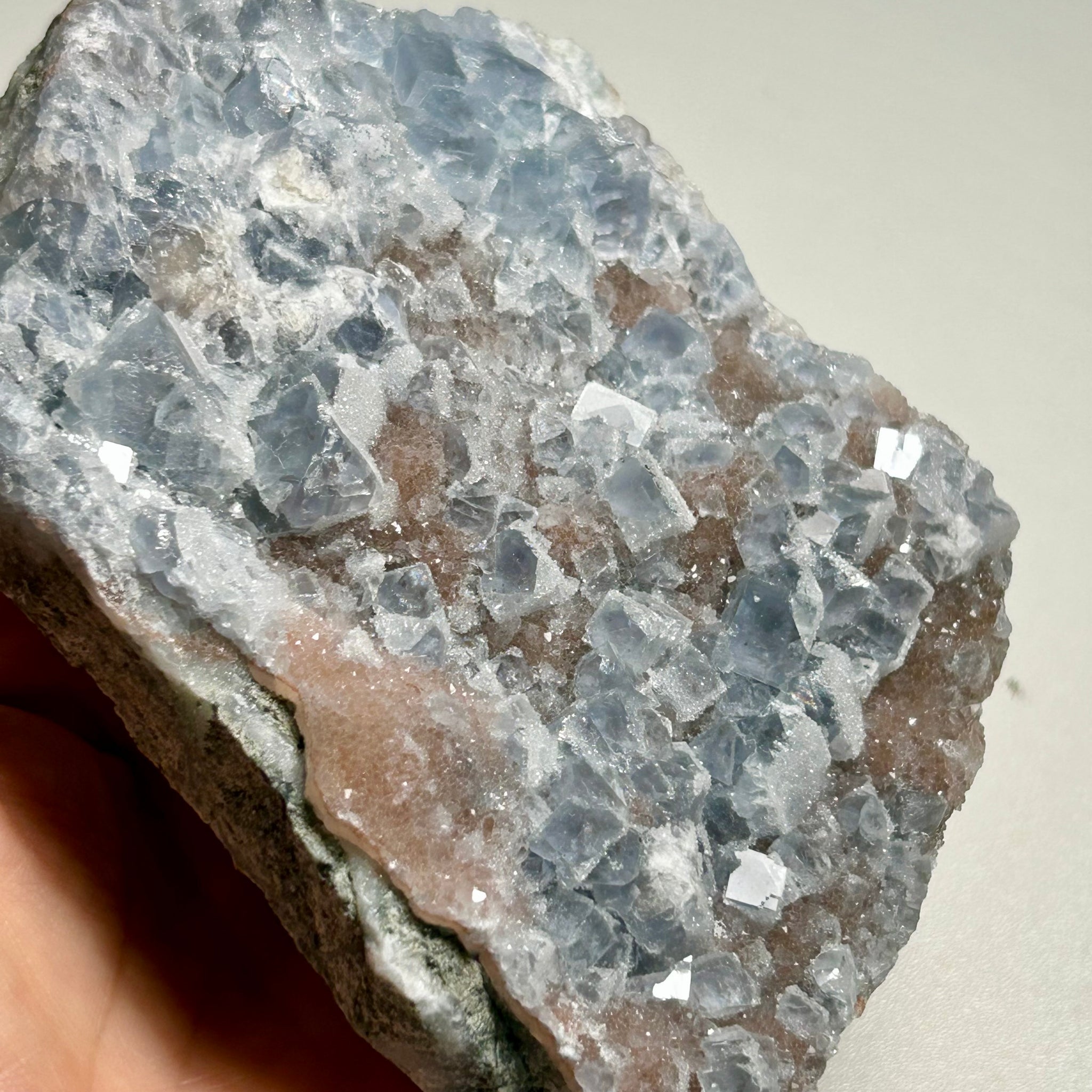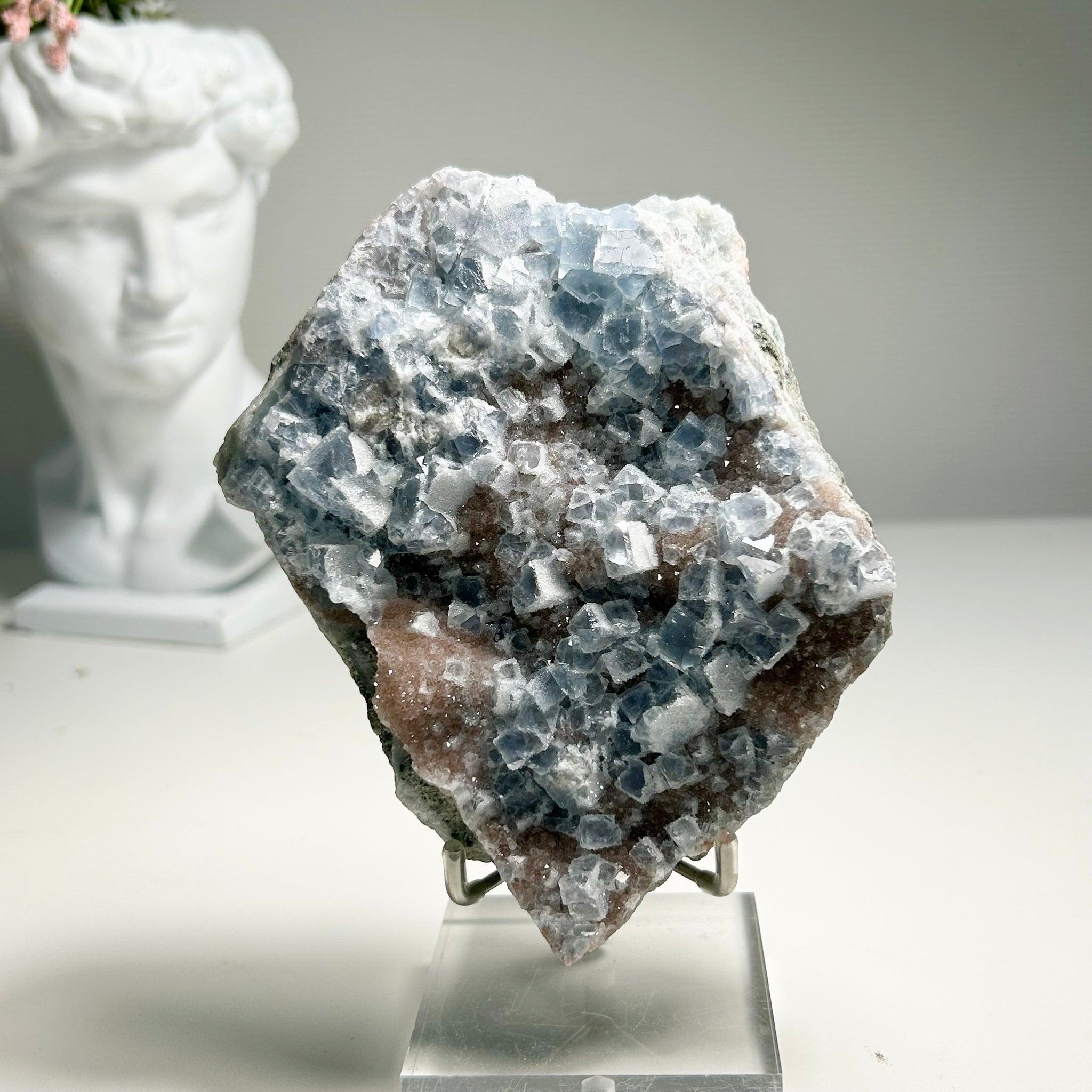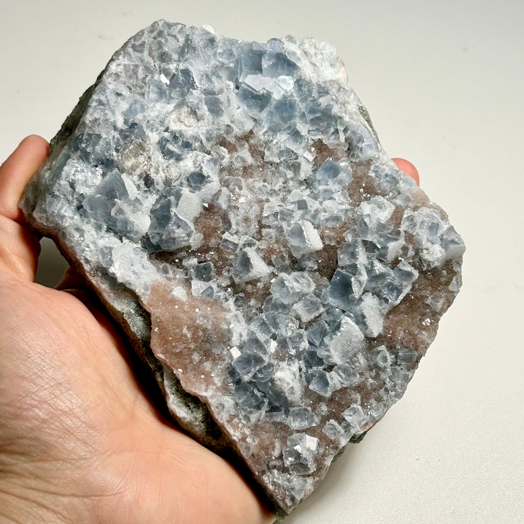 A natural frosted fluorite plate featuring dense icy blue cubic crystals.