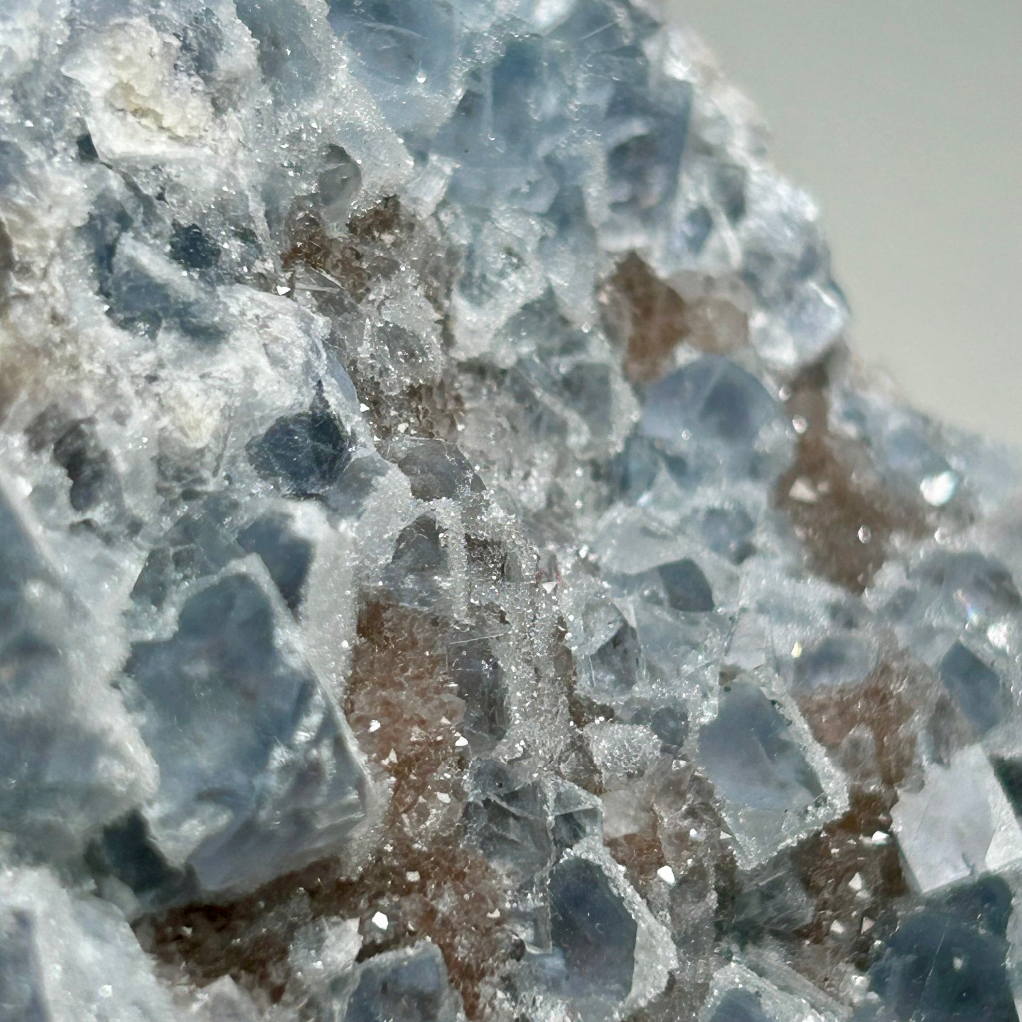 The surface shows the signature sugar frost texture creating a soft sparkle and refined mineral aesthetic. This specimen displays a calming blend of blue fluorite over warm mineral tones making it an elegant addition to home decor meditation spaces and mineral collections.
