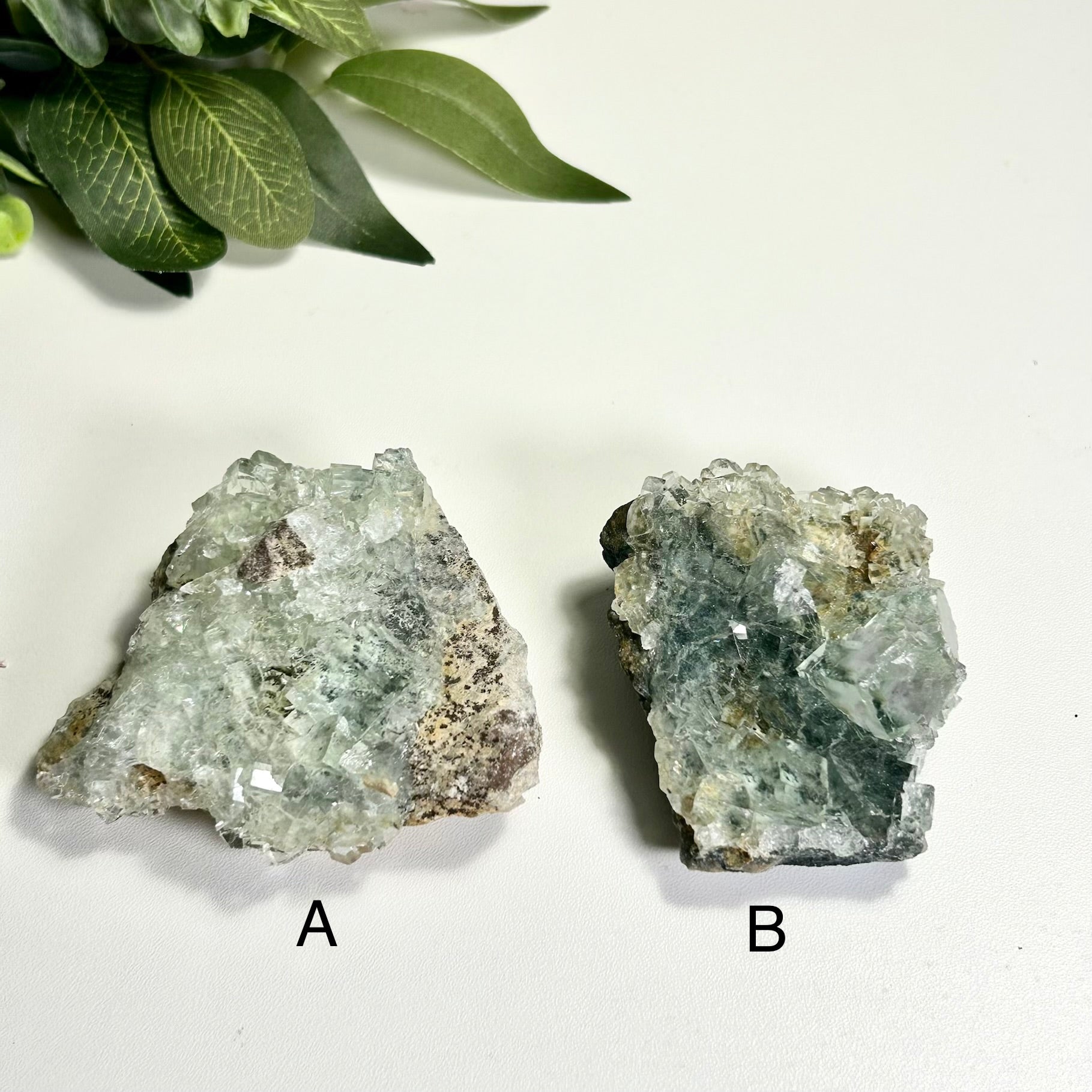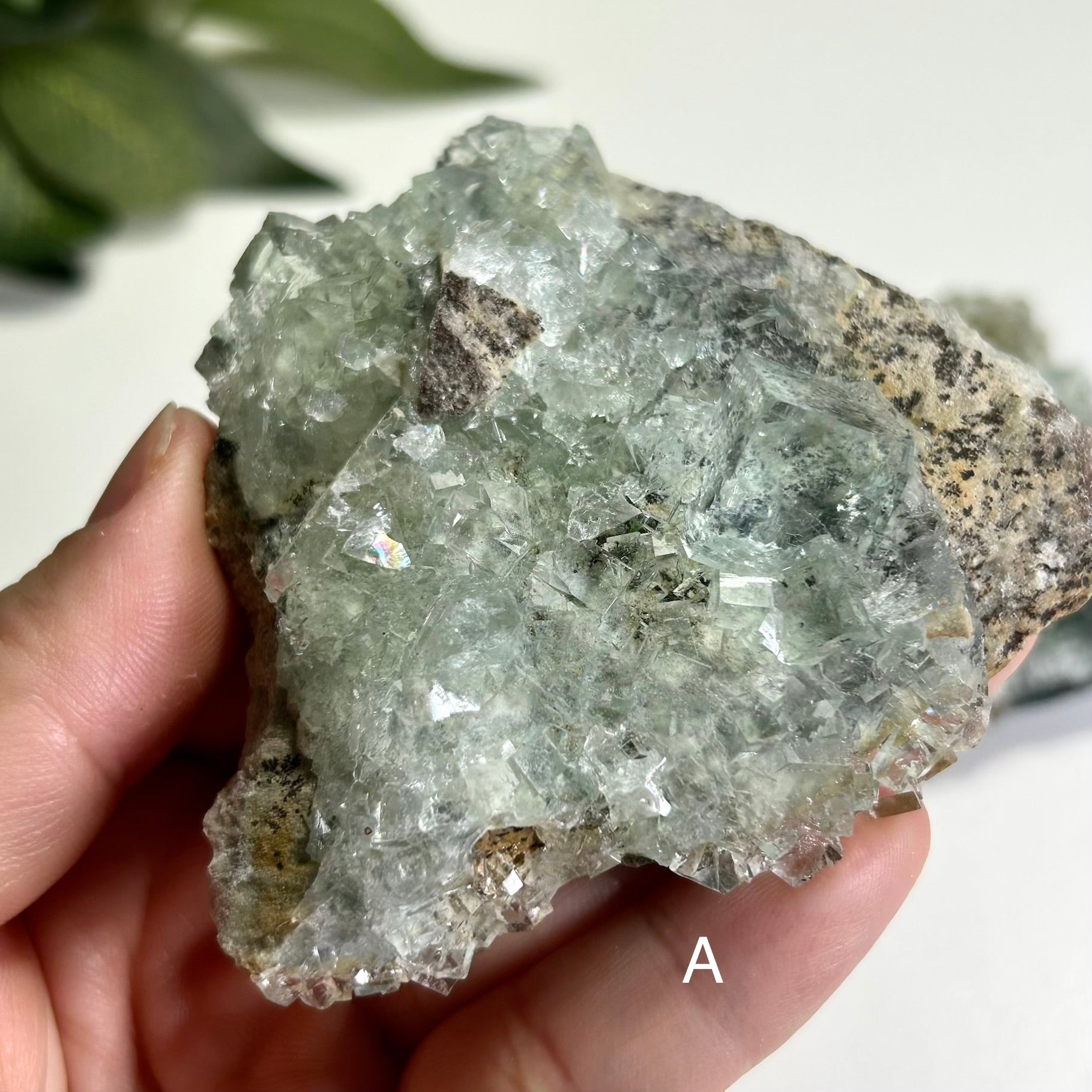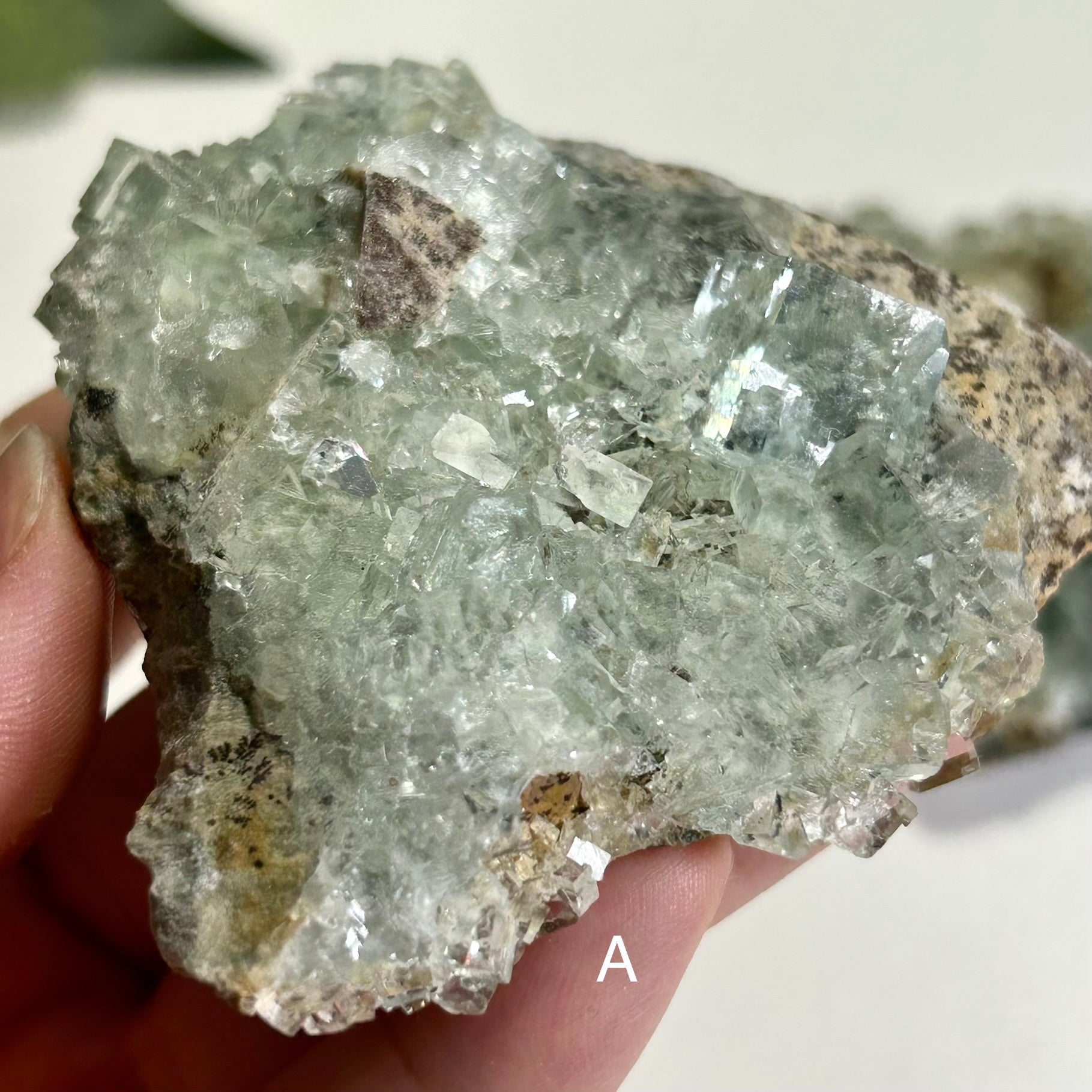 Natural fluorite crystals growing on matrix, featuring clear to pale green cubic fluorite with a glassy, aquatic appearance.