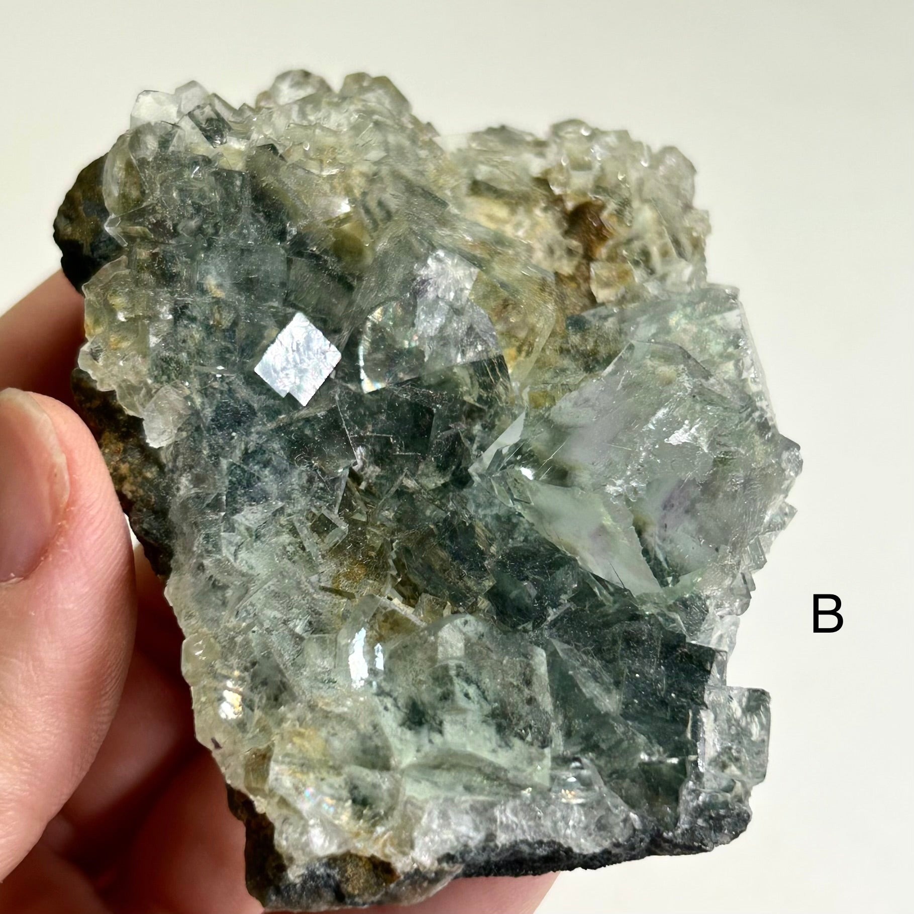 They are not inclusions inside the fluorite, but minerals growing organically on the host rock, creating a strong visual contrast between transparency and earth tones.The fluorite crystals show natural cubic growth with good luster and layered depth.