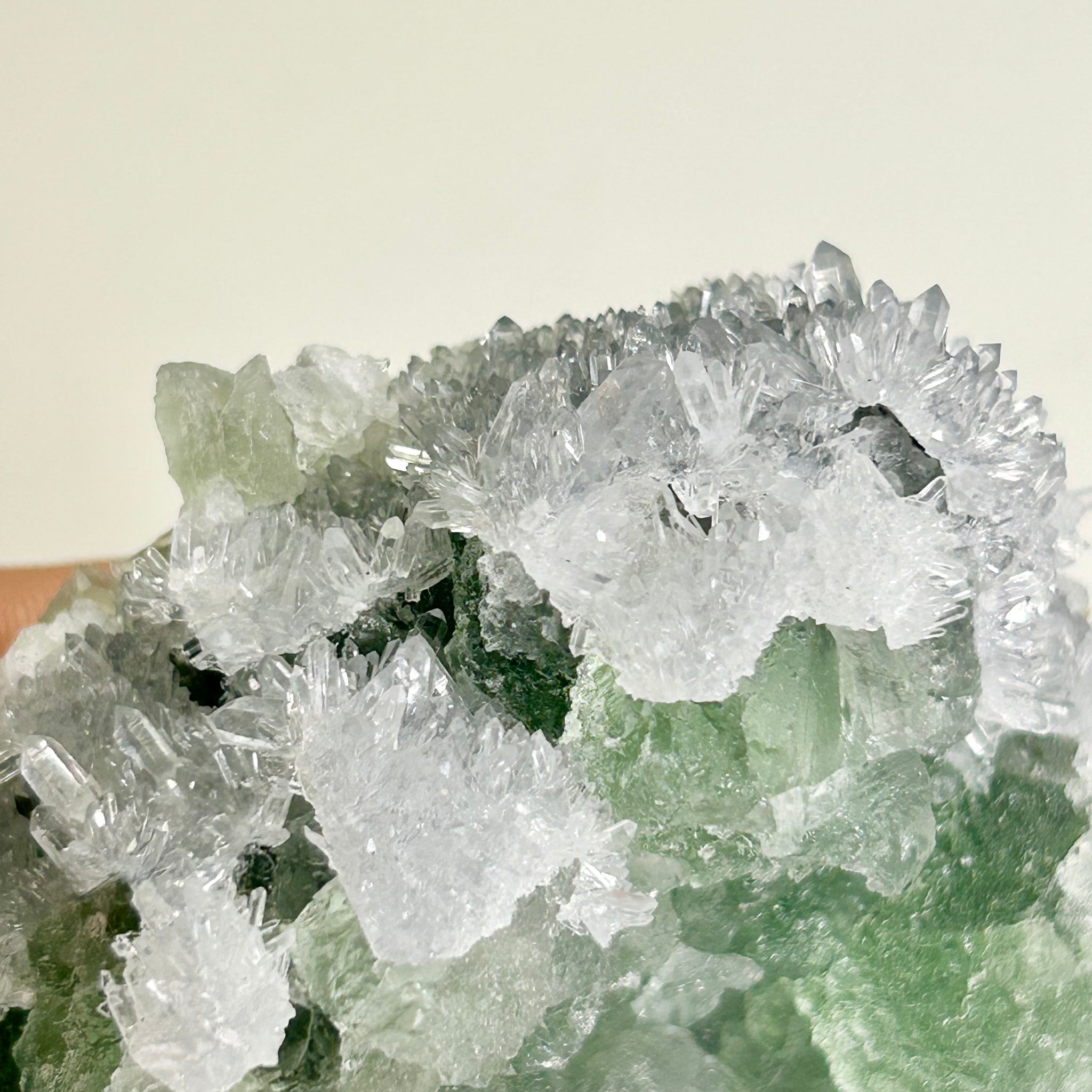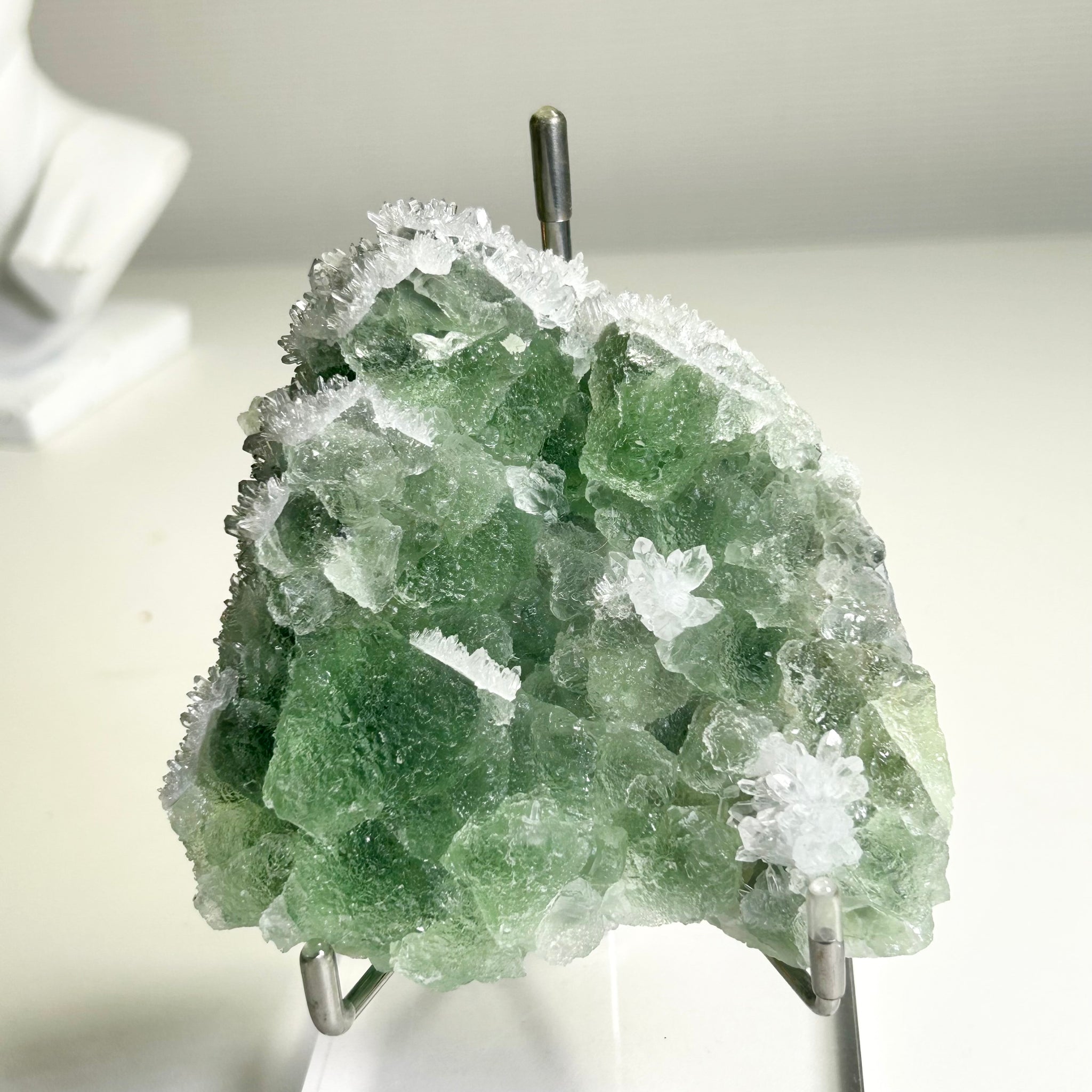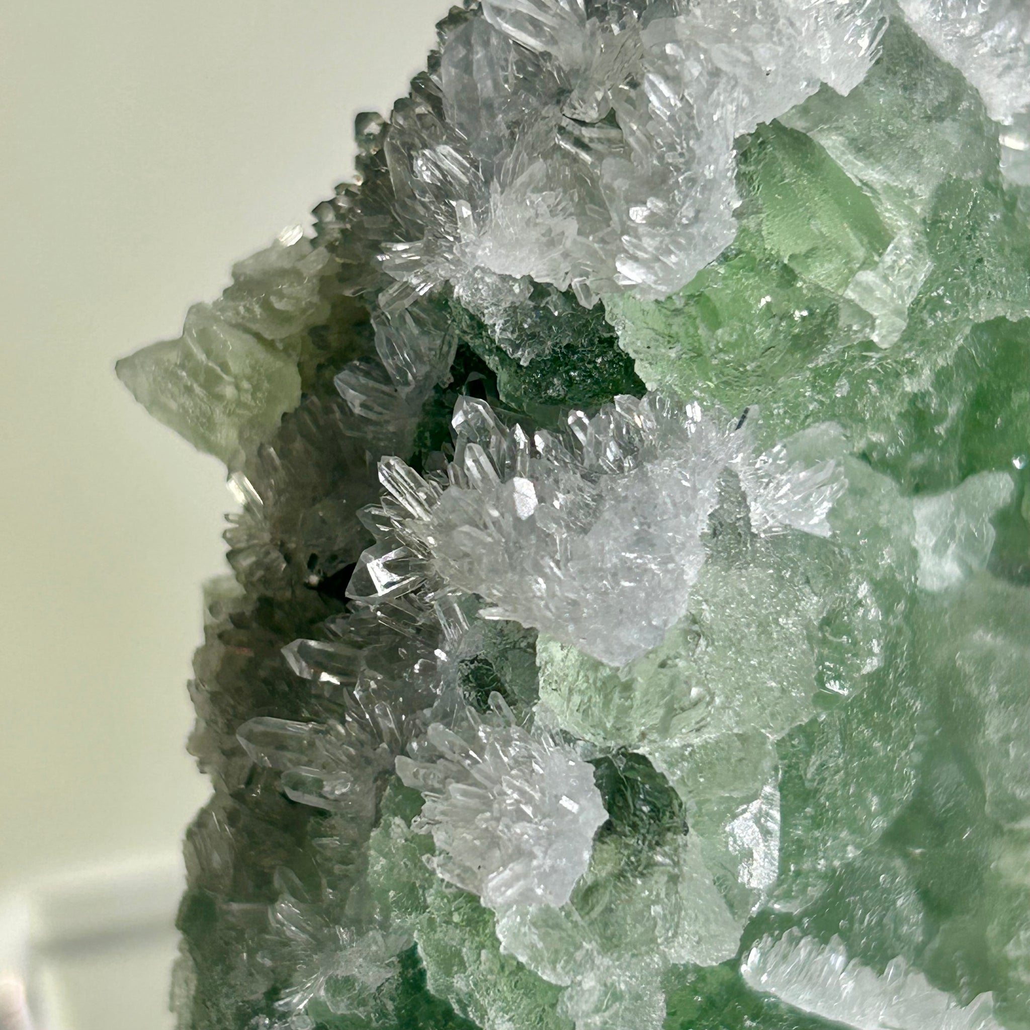 Green fluorite is often associated with clarity and calm. Many people place it in their workspace for grounding focus and gentle concentration. The combination of green fluorite and clear crystal clusters brings a clean, refreshing energy to a room.