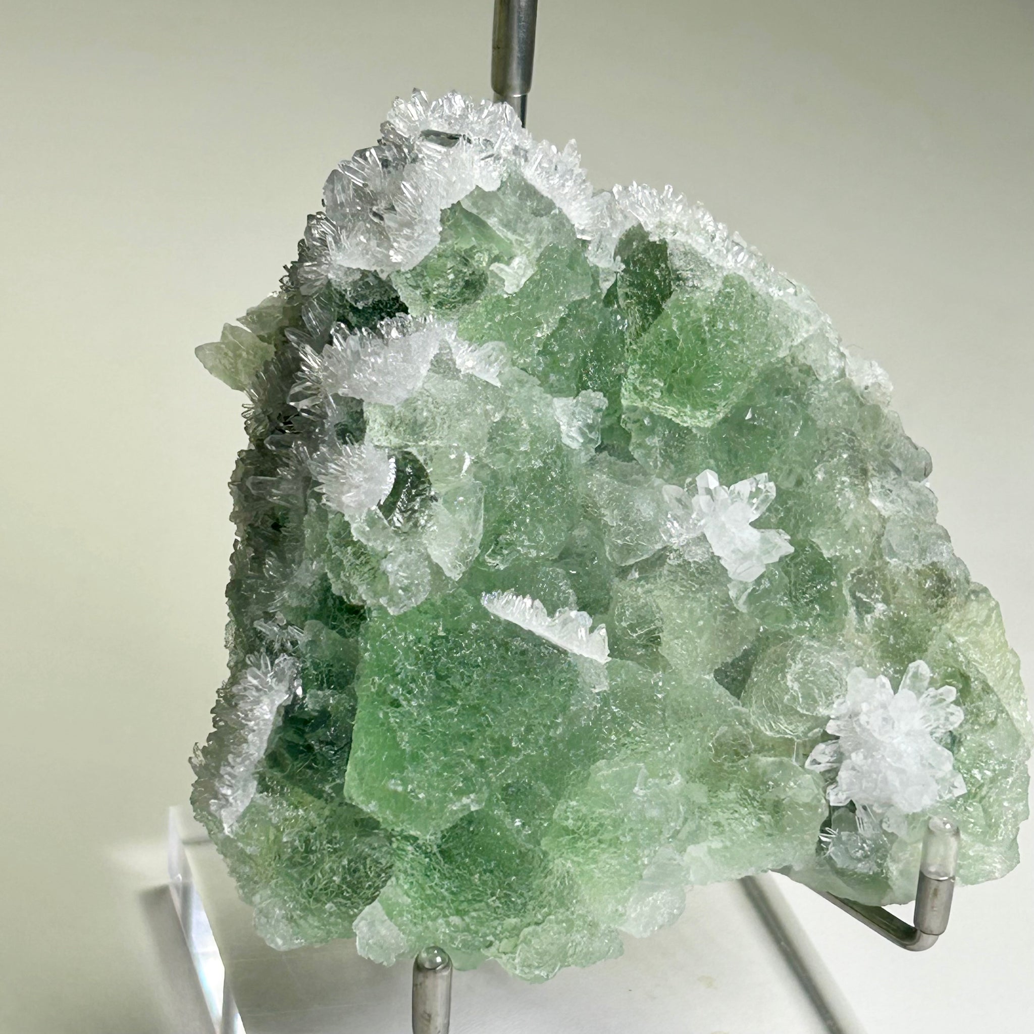 This is a rare green nipple fluorite featuring rounded dome formations and clear crystal growth scattered across the surface. The piece combines soft green translucency with icy white clusters, creating a striking balance of color and texture.