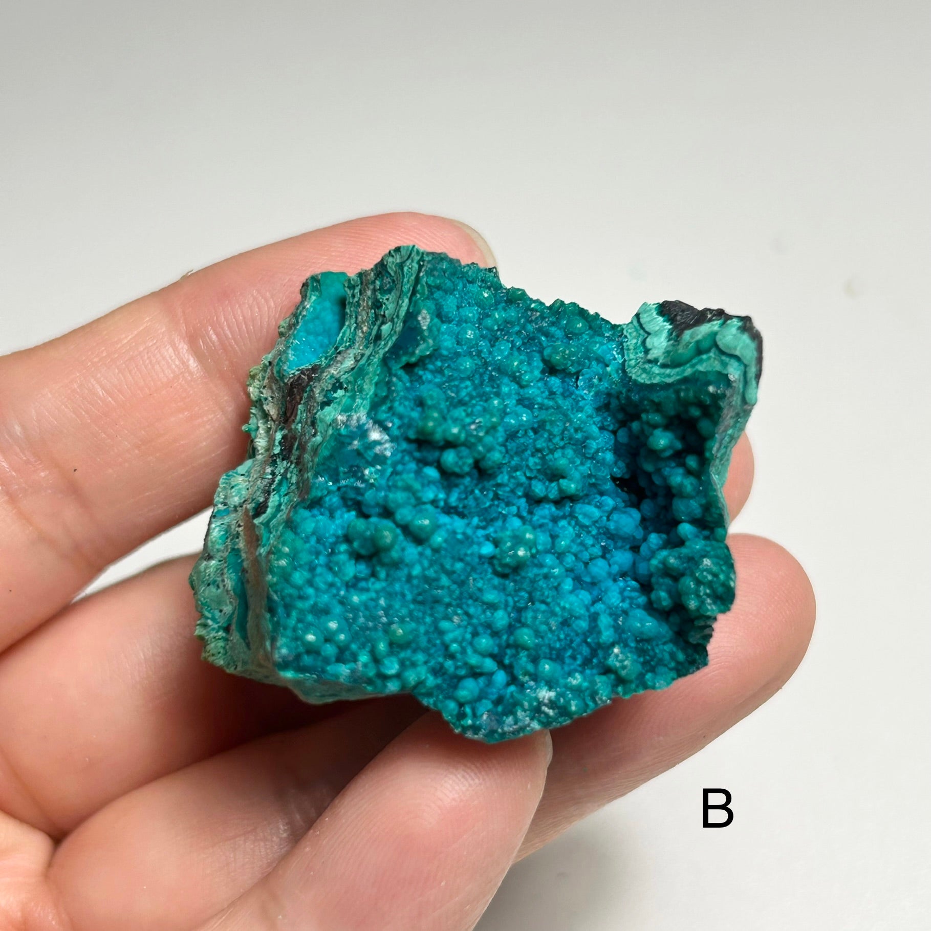 Both specimens display rich blue-green copper mineralization with natural variations in surface texture, layered formations, and botryoidal growth. Each piece is completely natural and unpolished, preserving its original geological character.