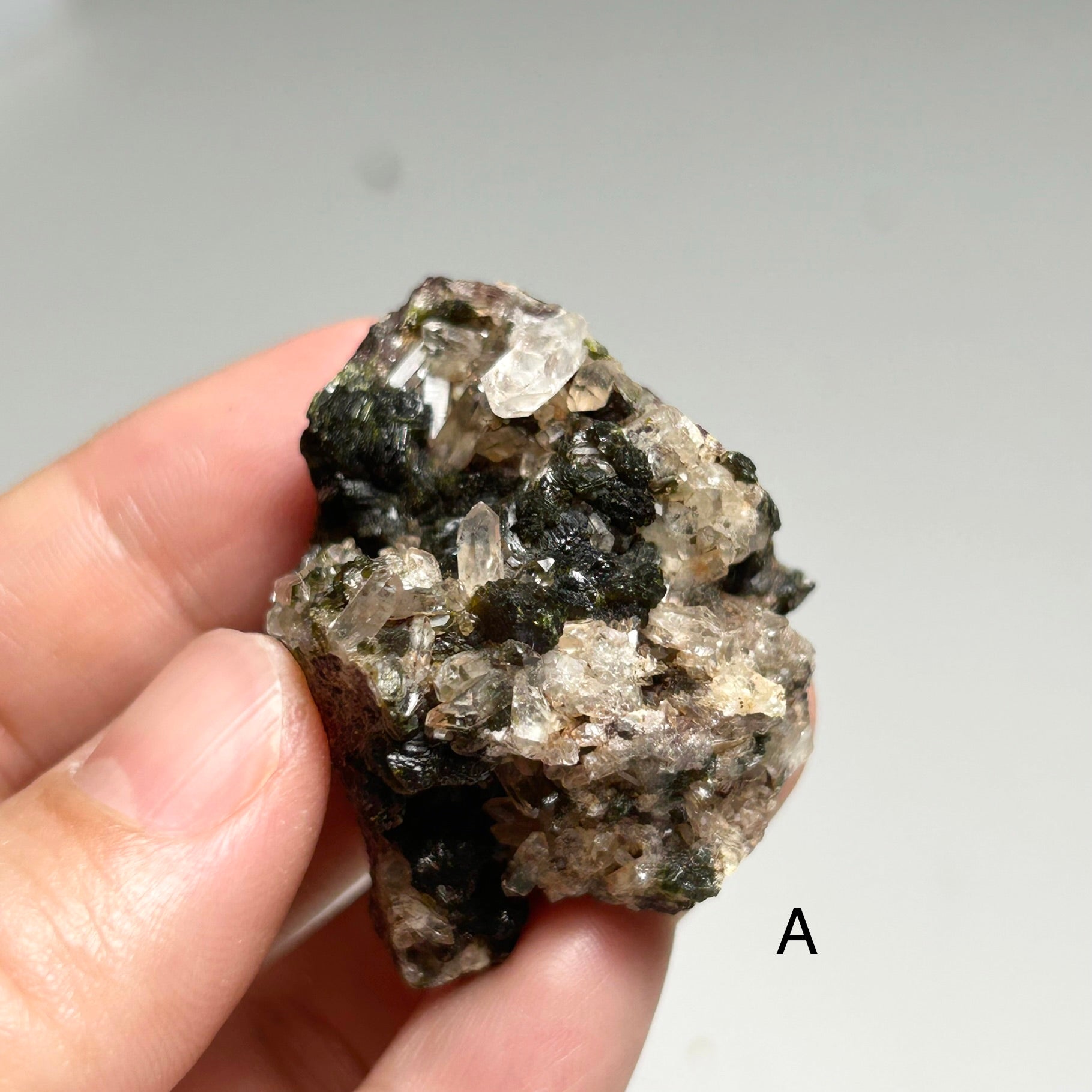 These specimens show clear to translucent quartz crystals with natural terminations, growing organically on dark green epidote-rich matrix. Crystal habits vary from compact clusters to more open formations, creating strong texture and depts