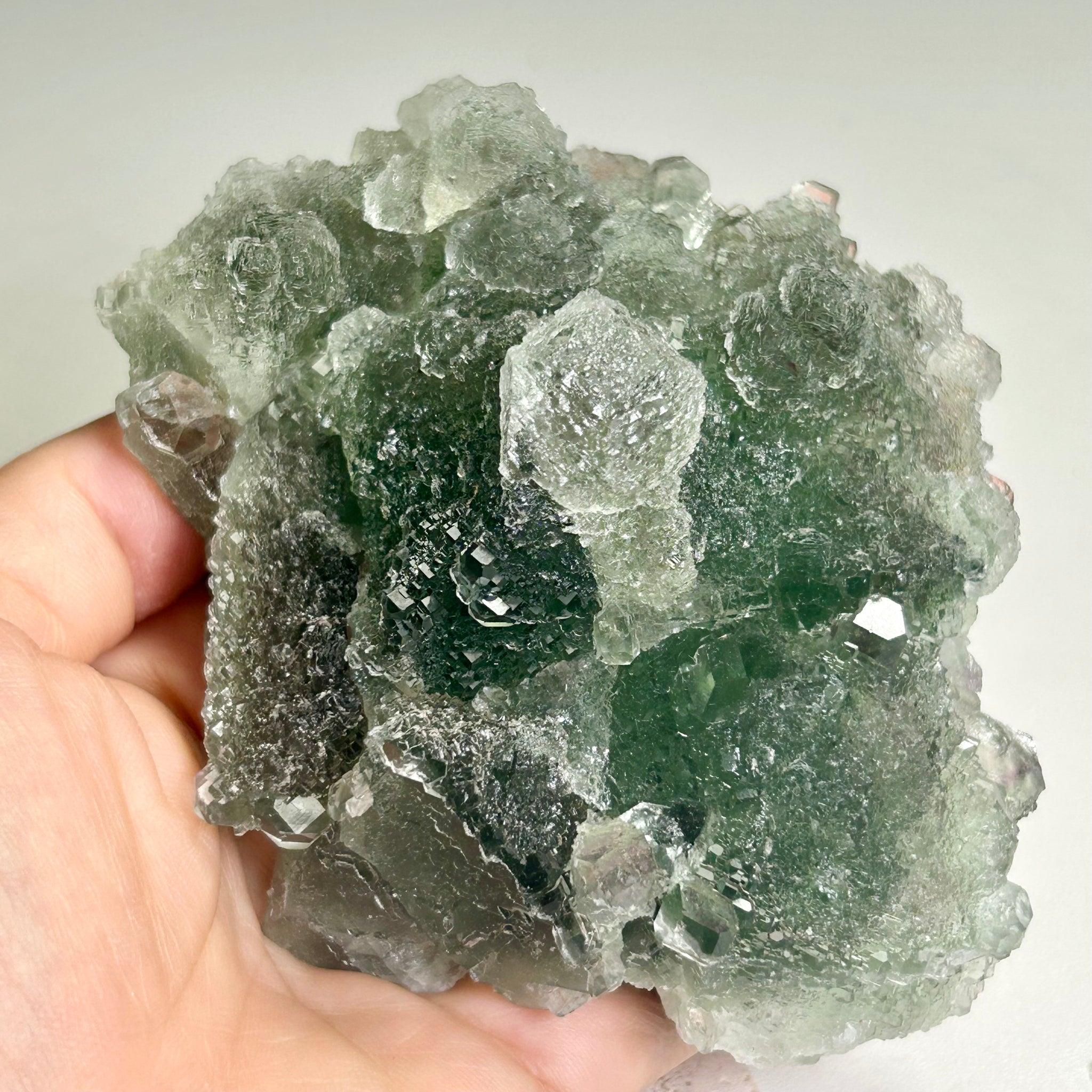 The top crystals show natural transparency and crisp reflective faces, a rare feature in nipple fluorite. Layers of light and deep green run through the cluster, creating a soft gradient that feels both soothing and visually rich. From every angle, the formation appears full and balanced, with well-preserved rounded domes and detailed natural growth.