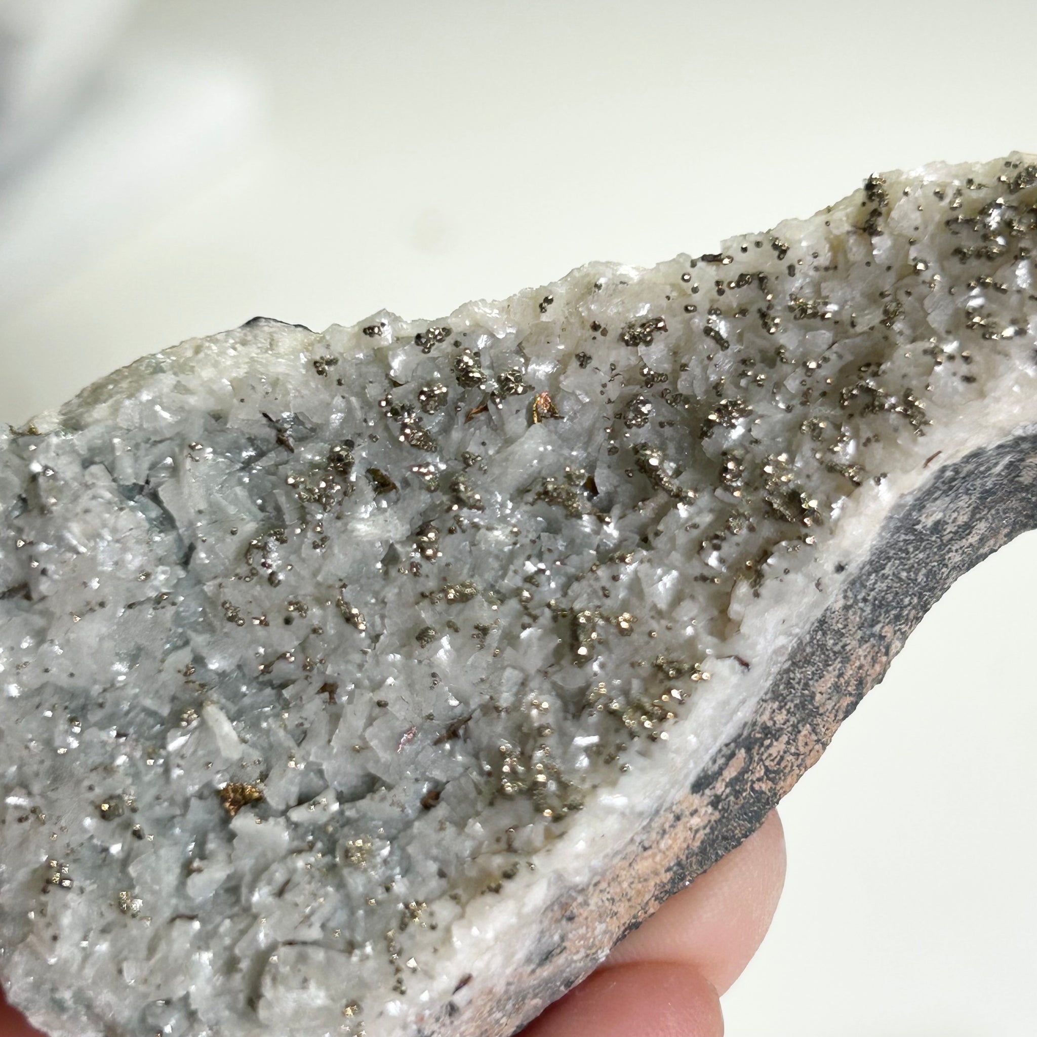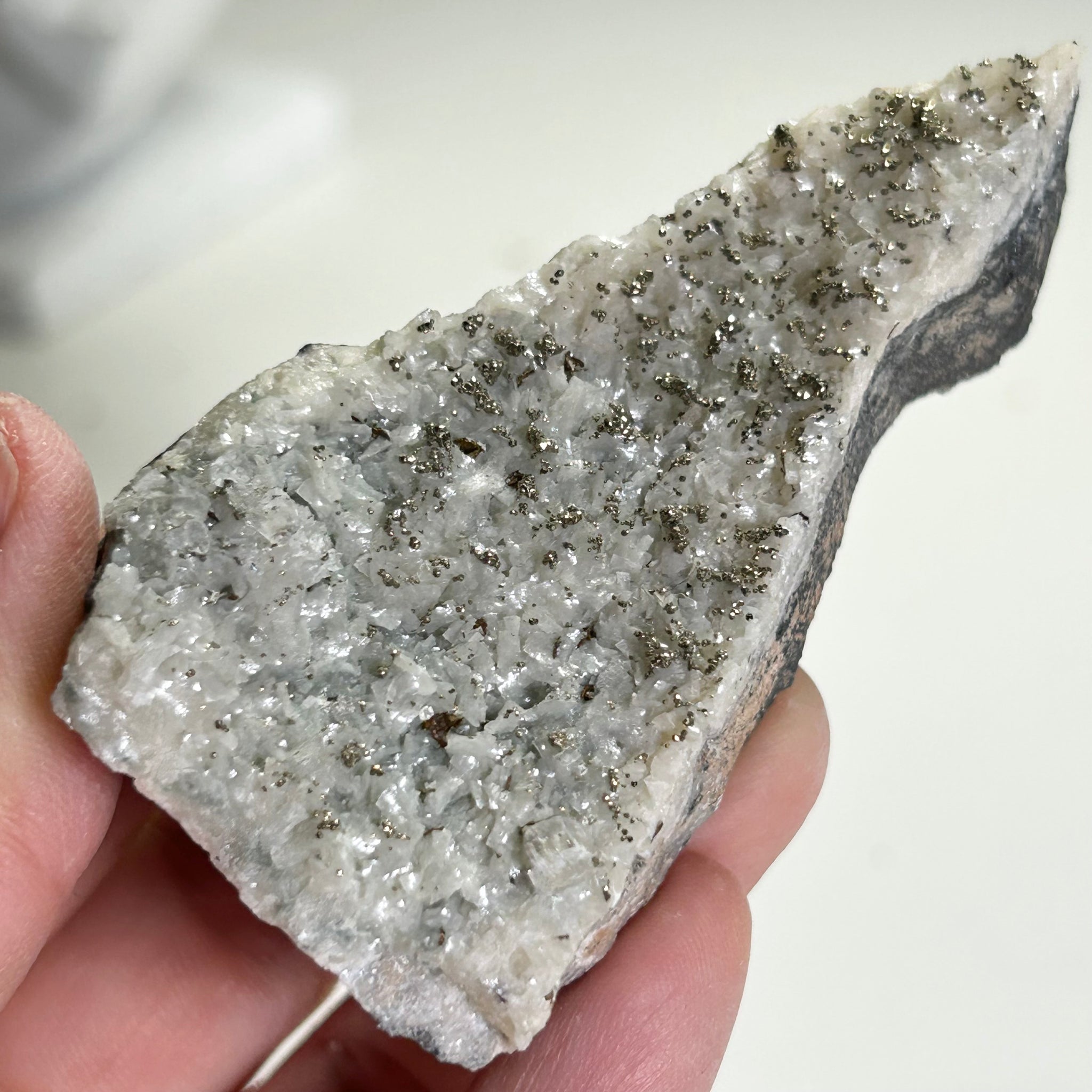 This specimen features a white crystalline calcite surface naturally dotted with golden pyrite, creating a beautiful contrast between soft white crystals and metallic luster. The pyrite is evenly distributed across the calcite, adding depth, texture, and eye-catching sparkle under light.
