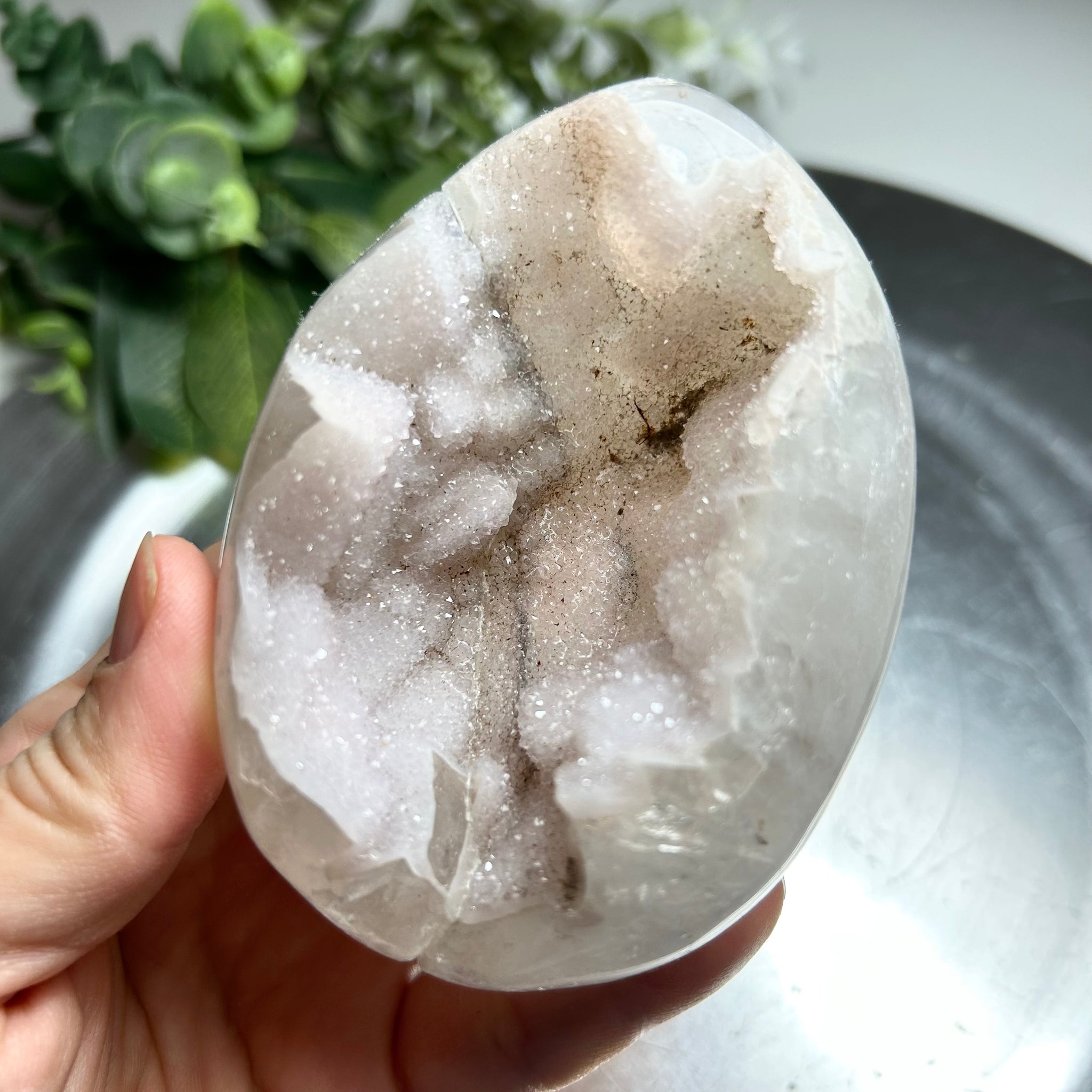 This piece shows soft tones and elegant druzy texture, perfect for décor, gifting and crystal styling.