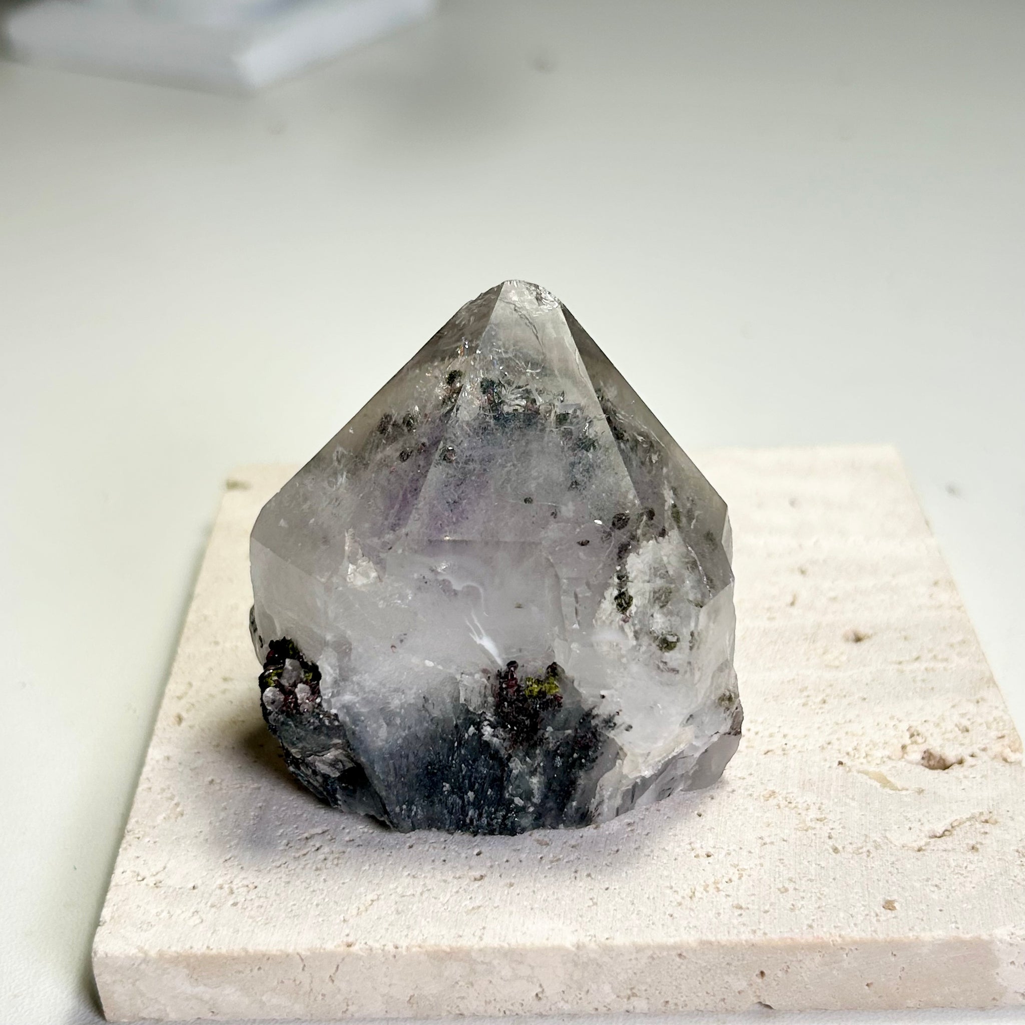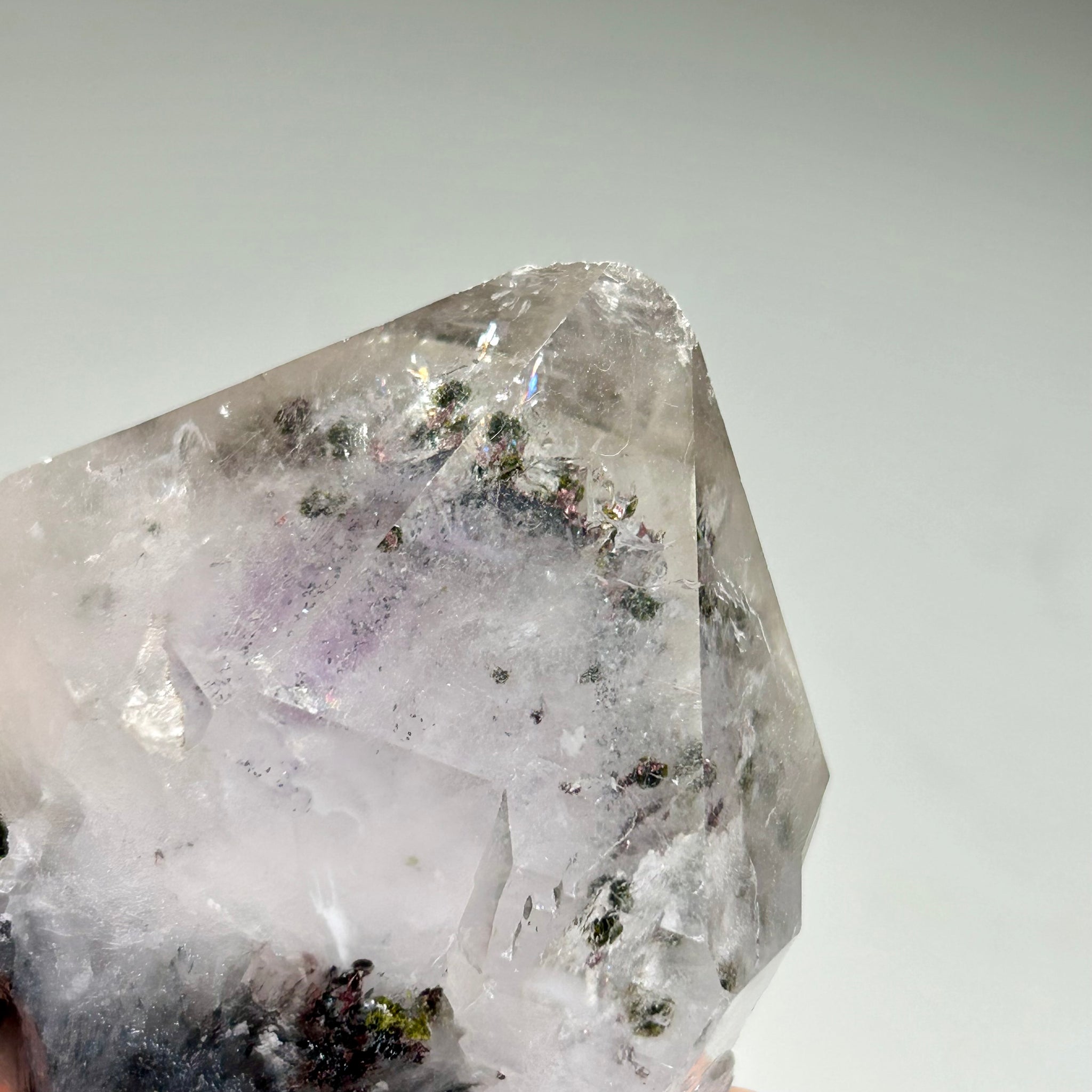 The crystal displays a well-formed termination and natural crystal faces, with translucent clarity and layered internal textures. The inclusions are distributed throughout the crystal, creating depth and visual interest when viewed from different angles.