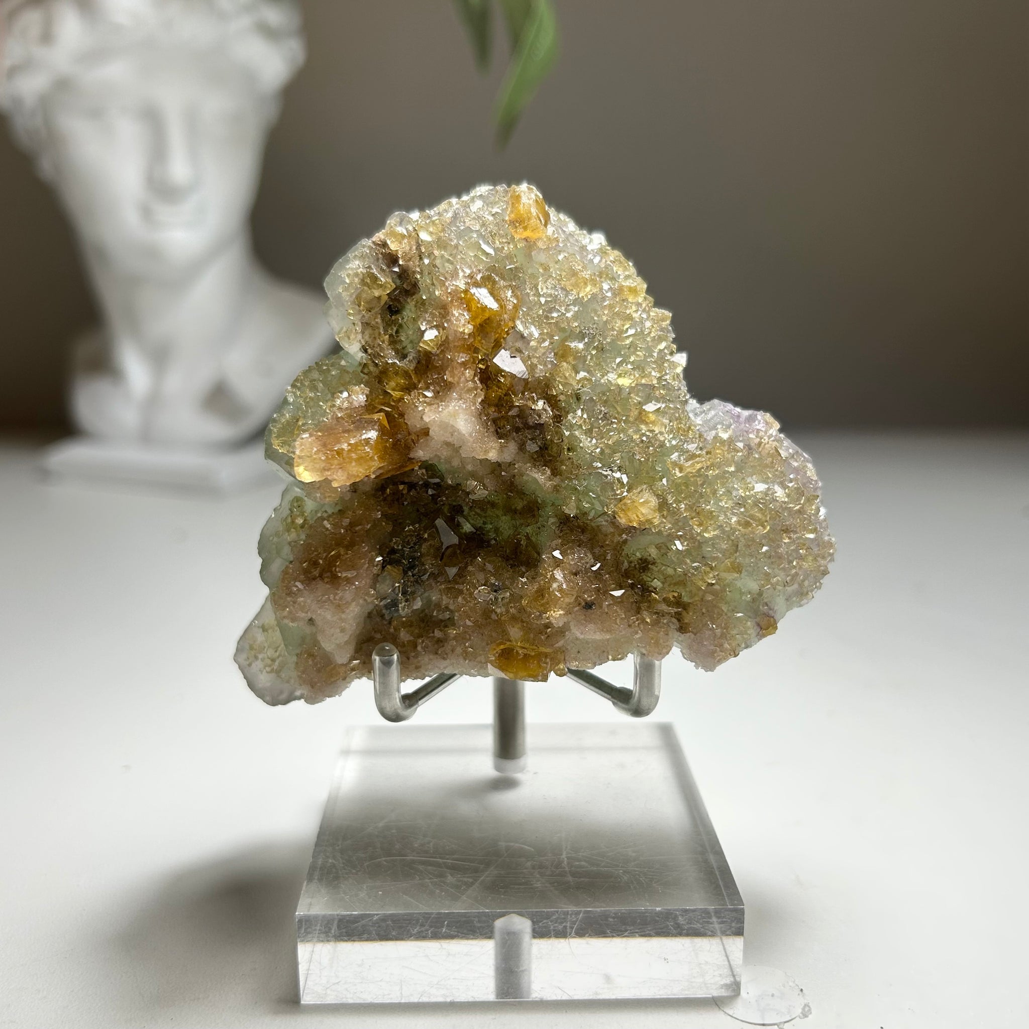 The specimen has an irregular, naturally sculptural form with good depth and balance, making it an excellent display piece for collectors who appreciate mineral associations and crystal texture rather than flat coverage.