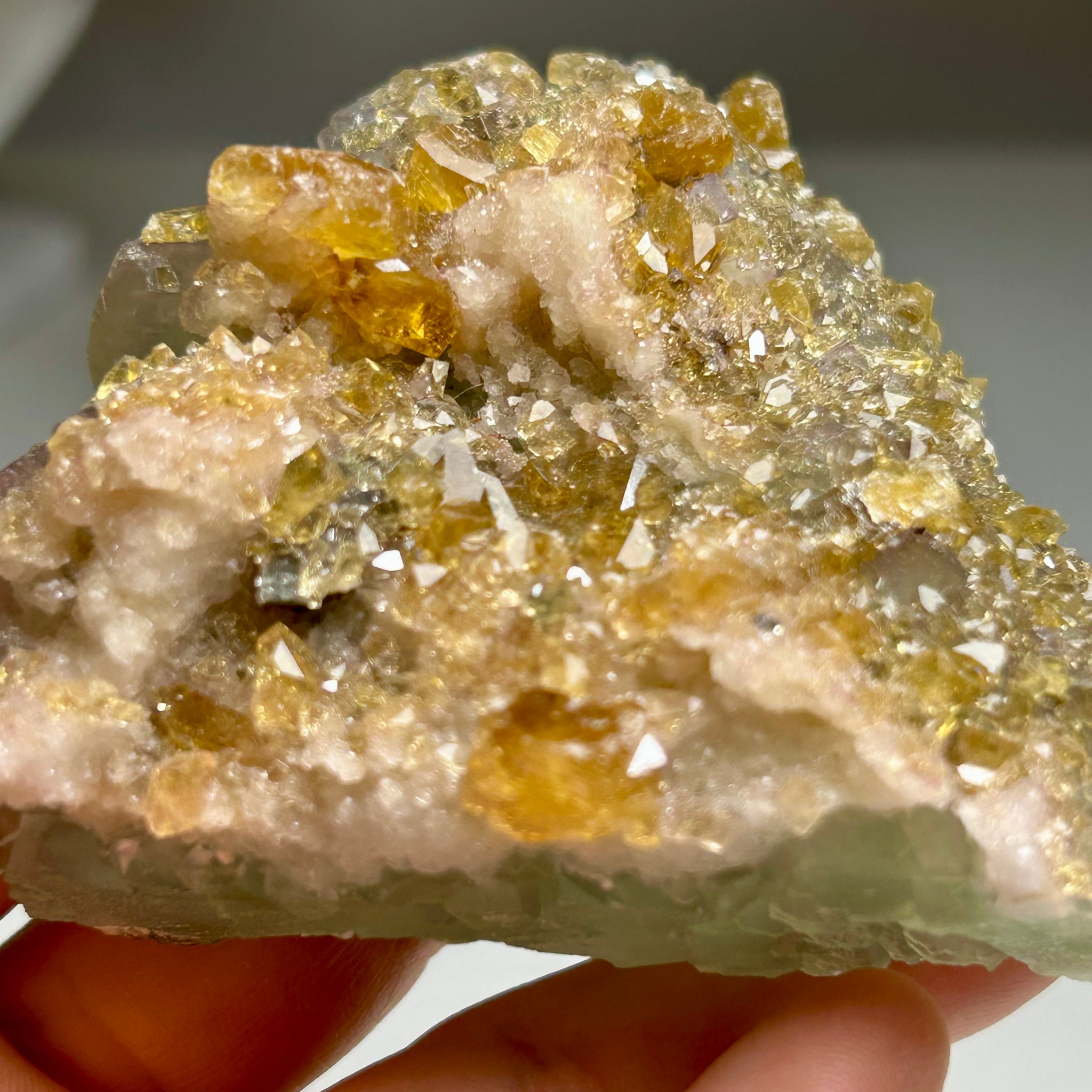 Golden barite occurs as well-formed crystalline clusters and scattered reflective faces throughout the surface, creating a layered, three-dimensional texture. Fine drusy crystals cover portions of the fluorite, adding strong sparkle and visual complexity under light.