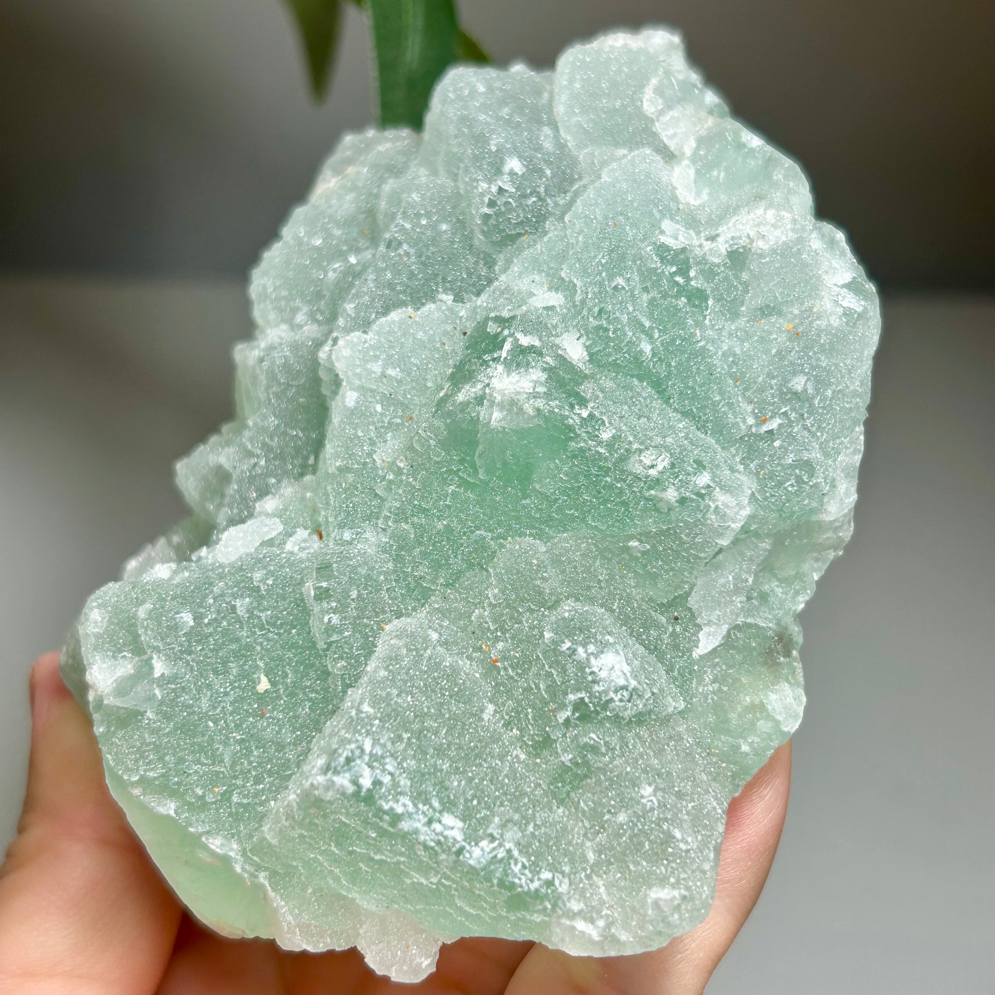 This specimen features a green fluorite cluster with a fine sugary surface texture, giving it a soft sparkle under light. The fluorite shows pale mint to light green tones with a frosted, granular appearance formed by countless tiny crystal faces.