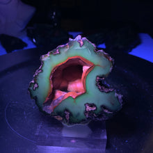 Unveil the mesmerizing Red Fox Agate Geode, boasting a radiant red center surrounded by captivating blue agate that glows under UV light.