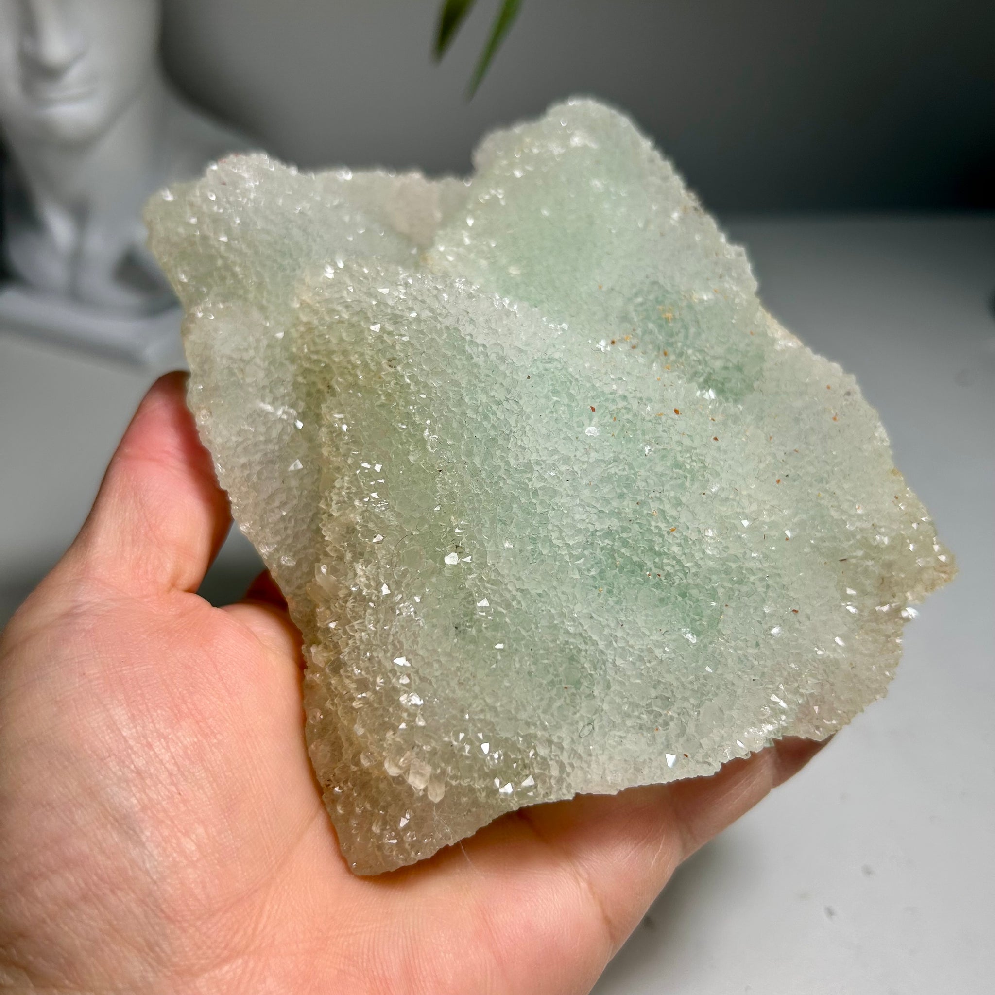 The piece features soft green fluorite beneath a fine layer of quartz druse, creating a natural contrast between translucency and shimmer.