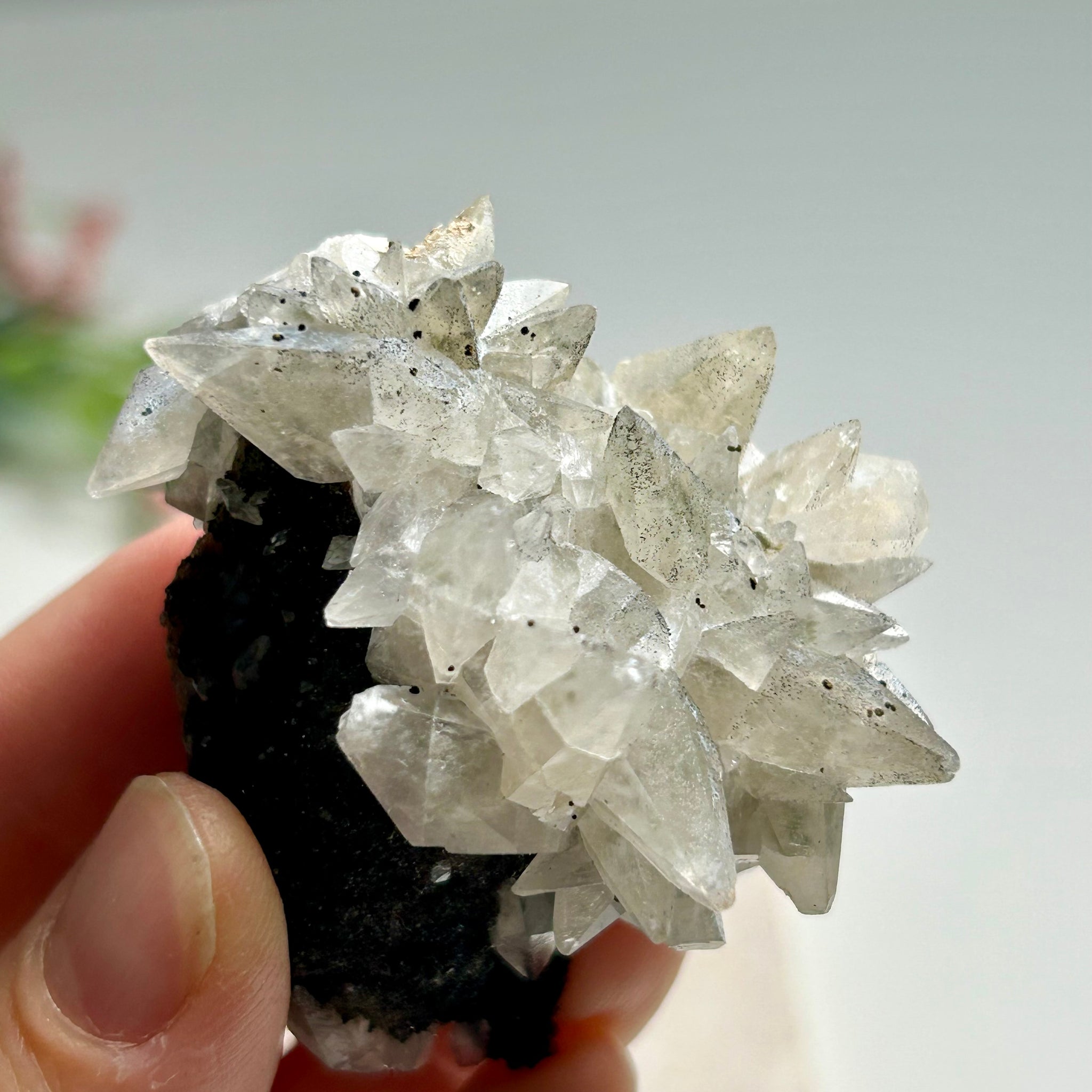 A unique dogtooth calcite cluster featuring sharp, transparent crystals dusted with natural anatase inclusions. The clear calcite points rise from a dark, sparkling matrix, creating a striking contrast in both texture and color.