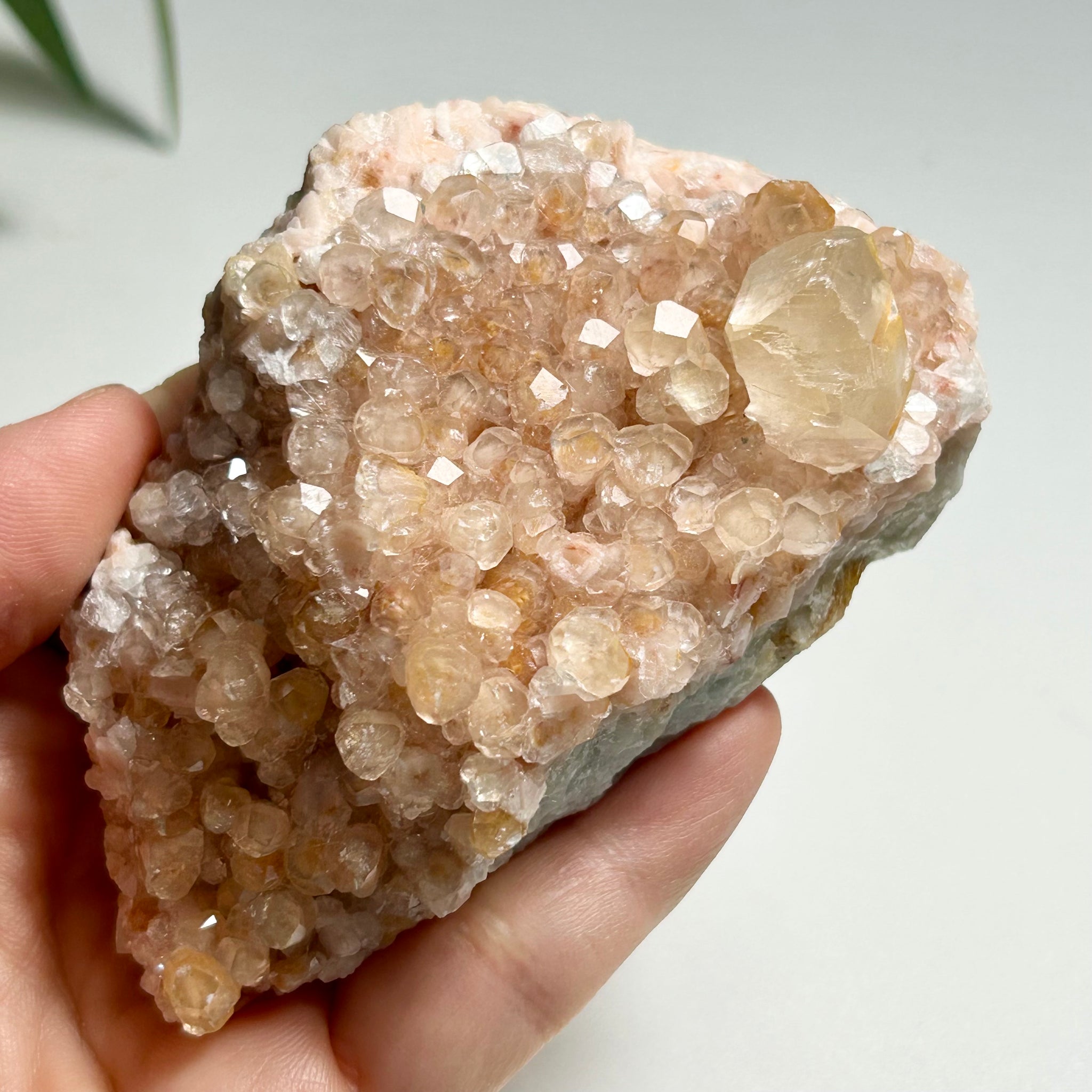 Mangano Calcite is known for its gentle energy, often associated with comfort, emotional healing and heart-centered balance. The honey calcite point adds clarity, motivation and grounding, creating a balanced and peaceful combination.